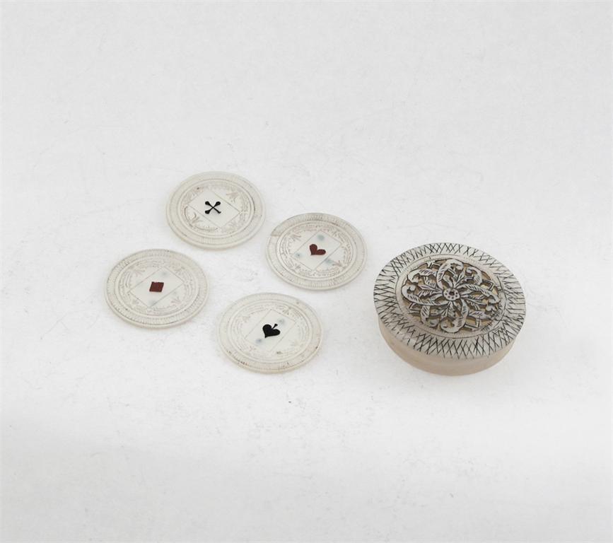 A 19th century mother of pearl whist counter box, with an engraved and pierced cover containing four 'trump' counters, 1.5in (3.8cm) diameter.