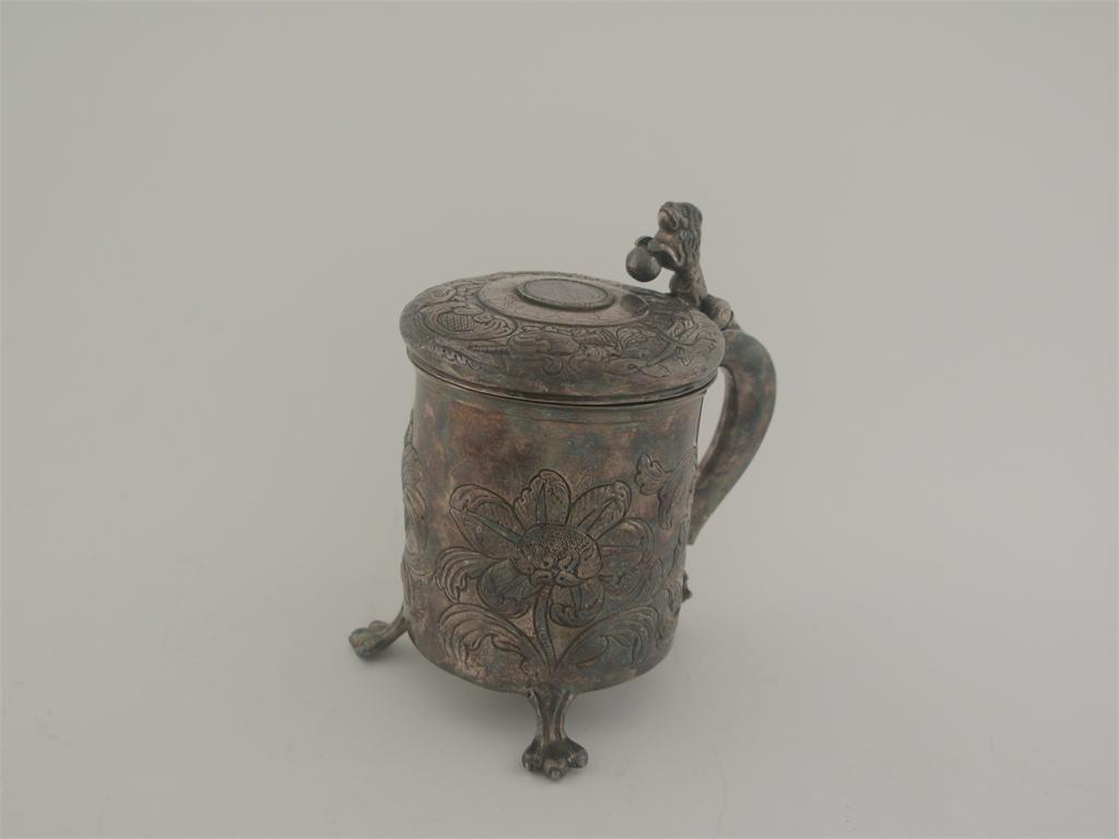 A Scandinavian peg tankard, on three paw feet with chased floral decoration and a lion and ball thumbpiece, the domed cover with floral chasing and an inset coin in the centre bordered by the inscription "JGSN 1740 RLDN", maker's mark AG [struck twice], probably 19th century 6.6in (16.7cm) high, 14oz.