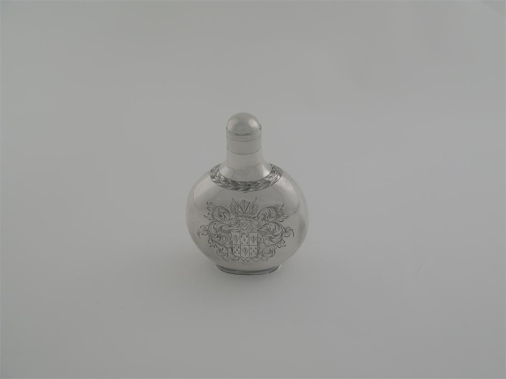 A Charles II spirit flask, on a reeded oval foot, with a screw cover, engraved with a coat of arms * within scroll mantling, maker's mark only, "BR" in monogram (Jackson's Revised pp134), c.1680, 4.75in (12cm) high, 4oz.