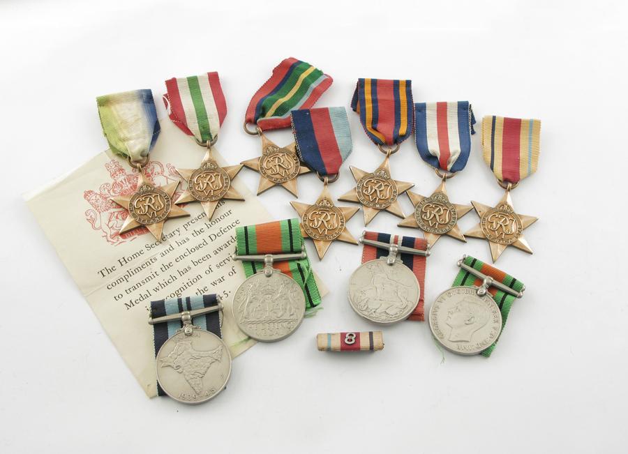 World War II; 1939-1945, Atlantic, Africa, Pacific, Burma, Italy, France and Germany; Defence, War and India Service Medals, possibly several from a group, very fine; with Defence Medal, in card box of posting.