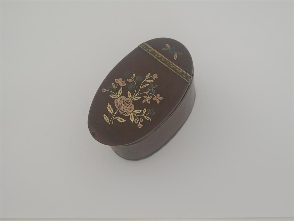 A late 18th century silvergilt mounted on inlaid lacquer snuff box, of oval outline with a deep body and a floral inlay on the cover, unmarked, probably French c.1790, 3in (7.5cm) wide.