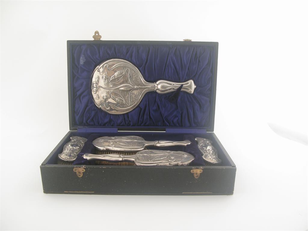 An Edwardian art nouveau cased five piece toilet/dressing table set: two hair brushes, two clothes brushes and a hand mirror each embossed with a pair of kingfishers and a stylised lily flower issuing from water, by W. Neale Birmingham and Chester 1905/1906. (loaded)