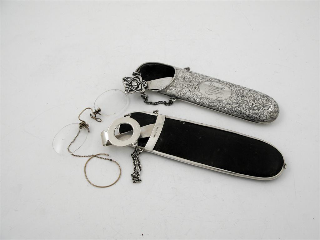 A mounted leather spectacles case, another engraved spectacles case both with belt clips, and a pair of pince nez A/F. (3)