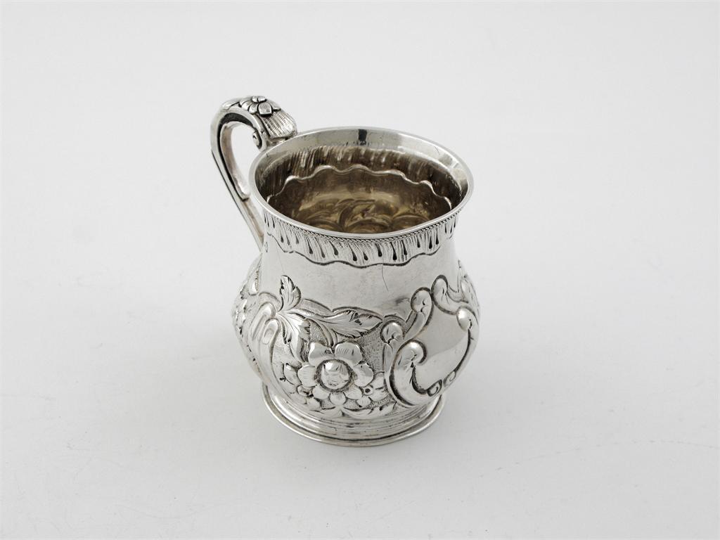 A George IV christening mug, with embossed decoration of flowers and swags to the lower body, vacant cartouche, scroll handle, gilt interior, by John Baddeley, London 1825, 3.5in (8.4cm) high, 3.7oz.