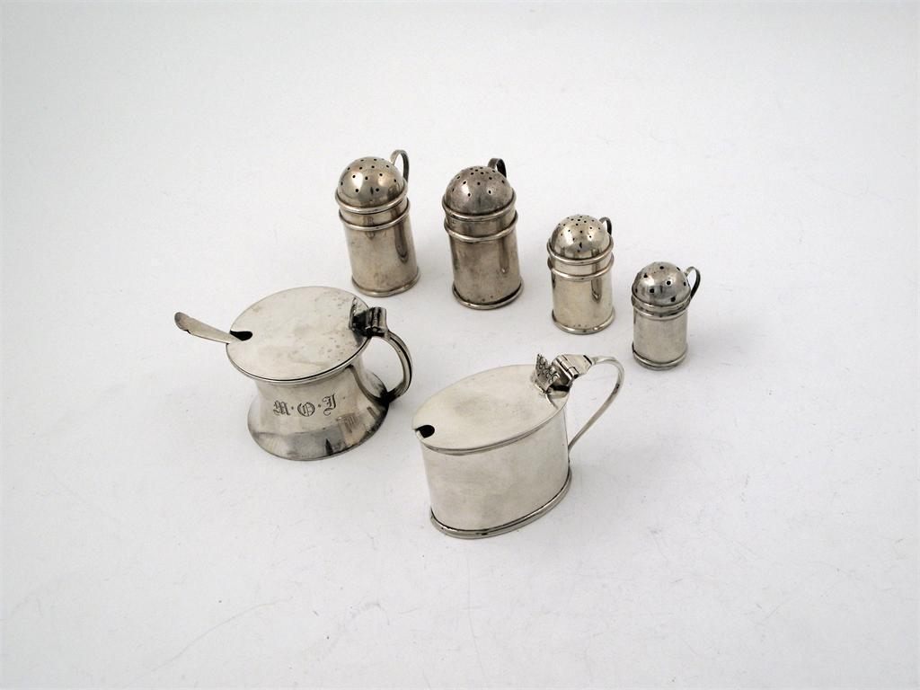 Condiments: an oval mustard pot (blue glass liner) as pool shaped mustard pot with spoon, and four various late Victorian/Edwardian kitchen pepperettes, 7oz. (7)