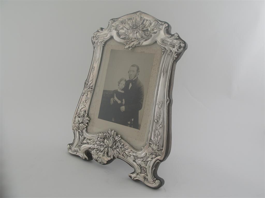 An Edwardian Art Nouveau frame, of shaped outline, stamped in relief with scrolling stylised chrysanthemums, easel back, by George Unite, Birmingham 1904, 12.6in (32cm) high.