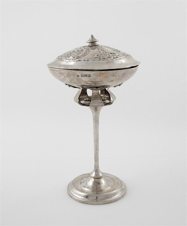 An Edwardian North Country, Art & Crafts stem cup and cover, with a knop finial flanked by briar roses in low relief, the pedestal rivetted to the bowl and centred by a rose boss, by F.F. Clarkson (also stamped "CLARKSON NORTHALLERTON"), Chester 1908, 8.8in (22.7cm) high, 16oz.