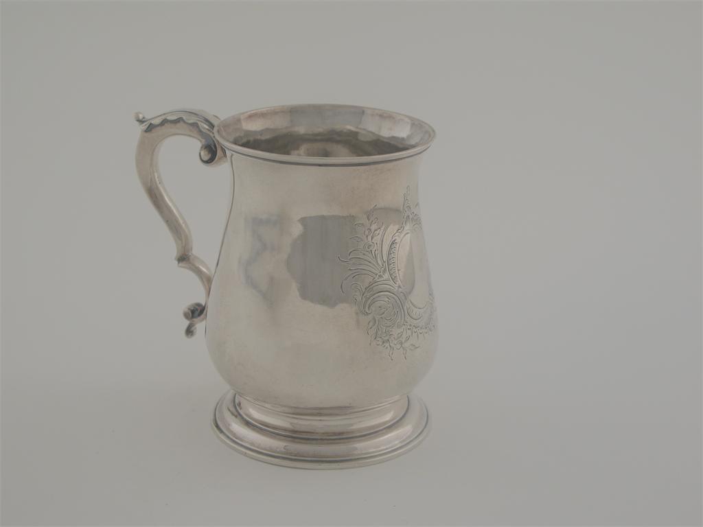 An early George III mug, with a leaf-capped scroll handle, a spreading circular foot and an engraved vacant rocaille cartouche, by William Shaw, London 1763, 4.3in (11cm) high, 8oz.