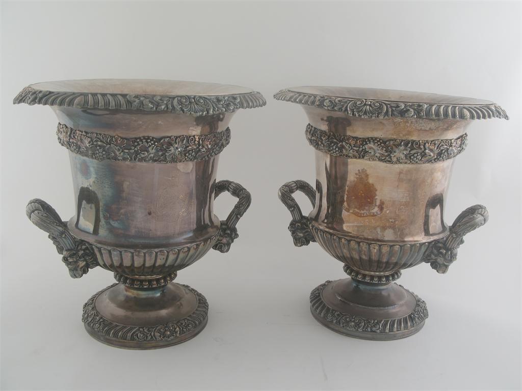 A pair of Old Sheffield plate wine coolers of campana form with part-fluting