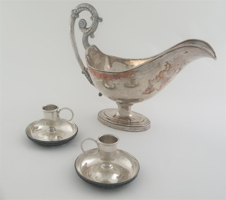 An electroplated pair of travelling chambersticks, (which fit together for travelling), initialled, c.1900, 3.25in (8.2cm) diameter, together with an early 19th century French, fused plated sauceboat. (2)
