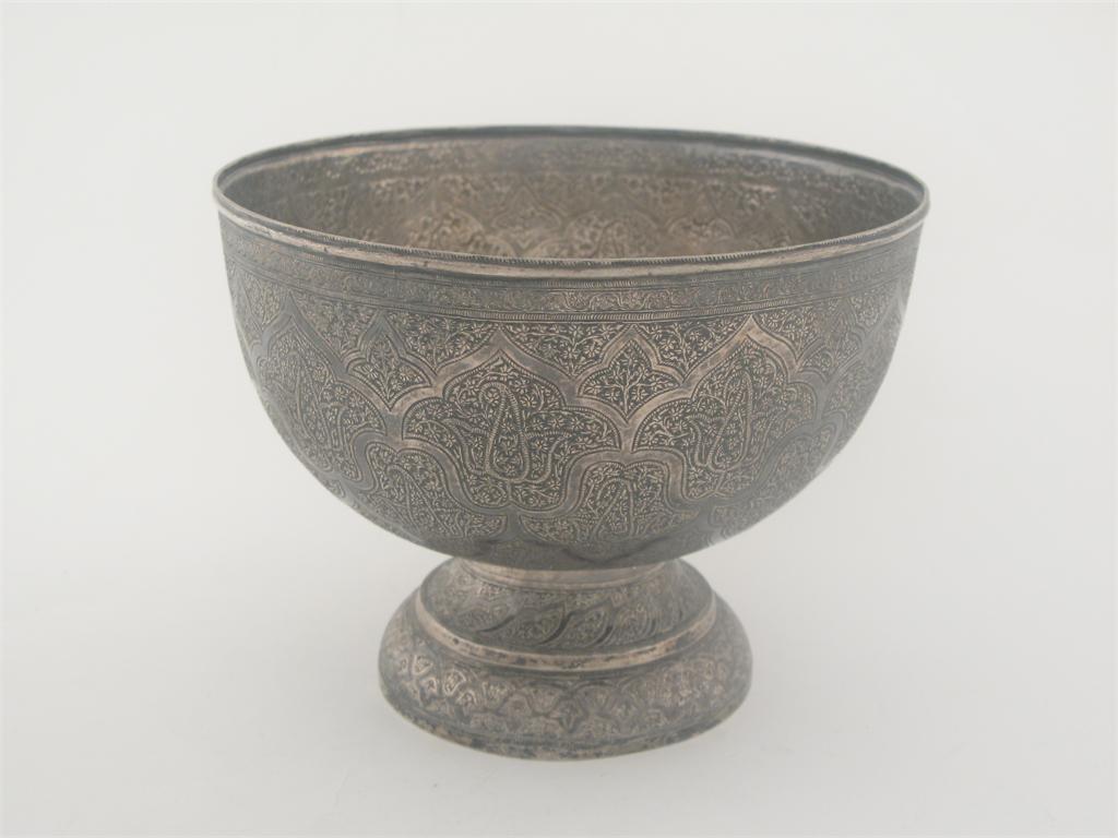 A late 19th century Persian rose bowl, on a domed foot, decorated all-over with chased stylised flowers in shaped reserves, below a moulded rim, unmarked c.1890, 7.5in (19cm) diameter, 22oz.