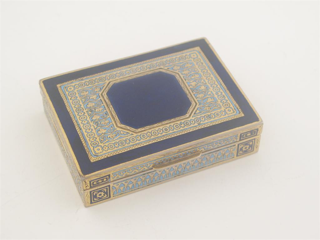 A continental silvergilt oblong snuff box, decorated with patterns of light and dark blue enamel and engraving, unmarked, 3.6in (9cm) wide.