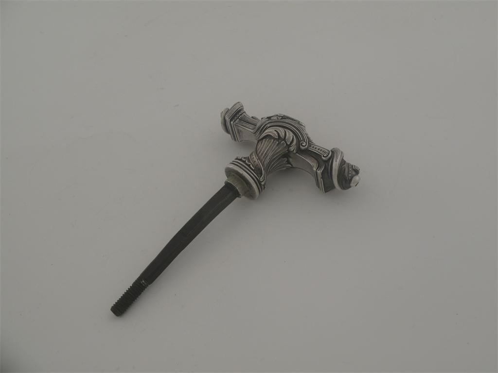 A cast carriage key with a steel pin, and thread, the 'T'-shaped handle decorated in high relief with rocaille scrollwork, matting and foliage unmarked, probably French early 19th century, 6in (15.2cm) long, 12oz gross.