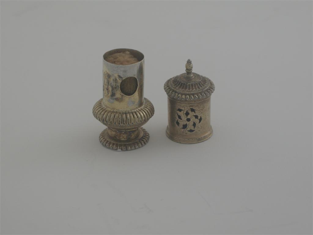 A late 17th century continental silvergilt pommander or smelling box, in the form of a small upright vessel with ribbed borders, a knop finial and a cylindrical neck with a pull-off cover, pierced with a floral pattern, the base initialled "C.E.B", unmarked, probably German c.1690, 2in (5.1cm) high.