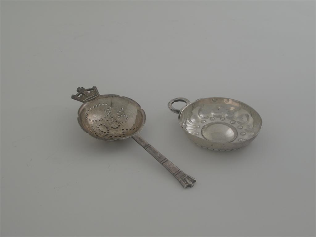 A modern teastrainer, with a crown lug and terminal, by R. E. Stone with commemorative marks for London 1935 and an early 20th century French wine taster, 3.5oz. (2)