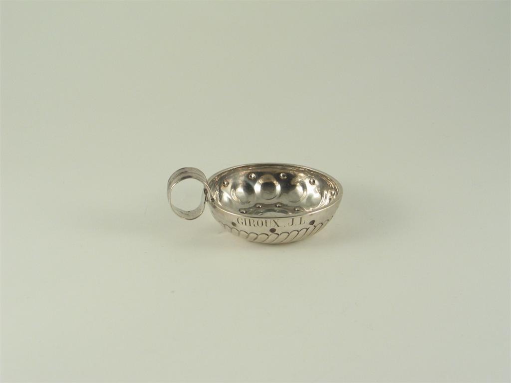 A 19th century French wine taster, with a reeded ring handle, the bowl embossed with fluting and studding, inscribed "GIROUX, JL", post 1839, 3.1in (8cm) diameter, 2.5oz.