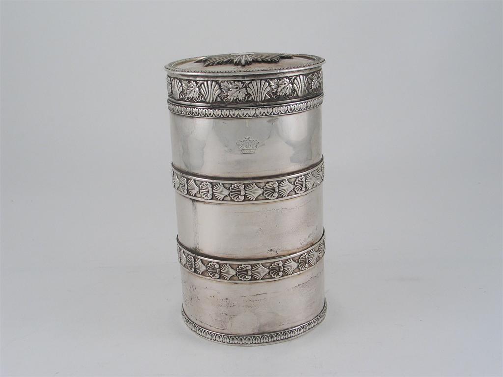 A George III curious cylindrical box* and cover with applied borders of shell motifs, a frieze of shells and vines and a tongue and dart border around the cover, engraved Baron's coronet, Joseph Ash, London 1809, 7.3in (18.6cm) high, 24oz.