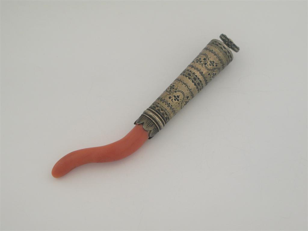 A George III silvergilt mounted coral teether, with a tapering cylindrical body and swivel terminal, unmarked c.1785, 4.8in (12.4cm) long.