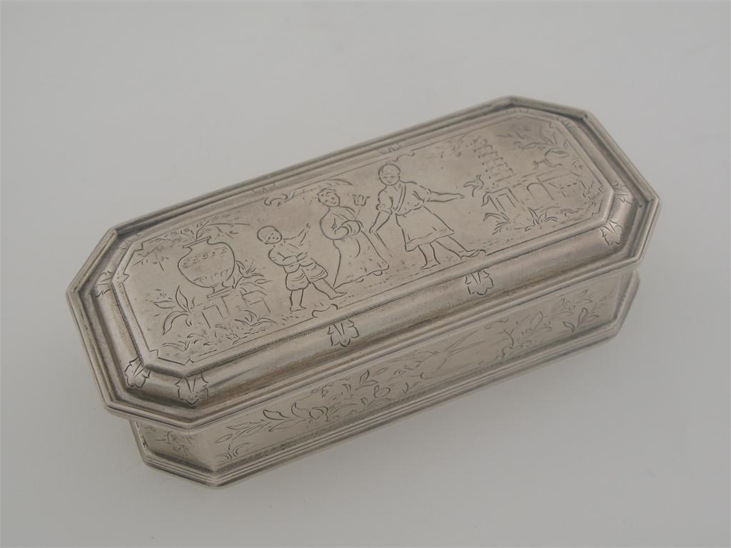 A canted oblong dressing table box, decorated with chinoiserie figures and landscapes, by D & J Welby, London 1920, 5.5in (14.2cm) long, 10oz.