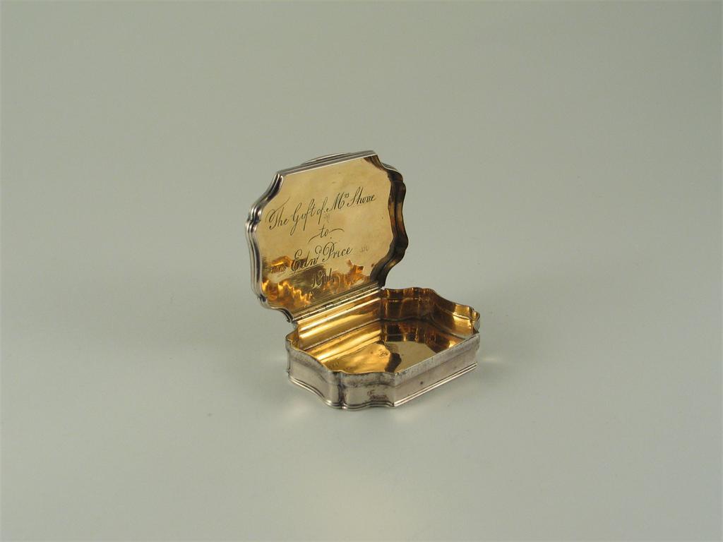 An interesting George I/early George II snuff box, oblong with shaped sides and hinged cover, inset with an embossed plaque depicting a putto proferring fruit to a seated nobleman in a garden setting with birds and animals in attendance, the inside cover inscribed