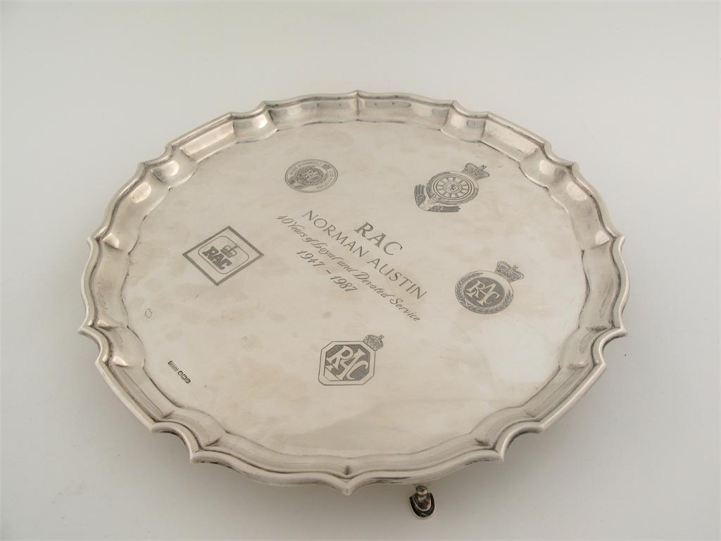 A modern salver, with a shaped and moulded border, engraved with five various badges of The Royal Automobile Club and inscribed "RAC NORMAN AUSTIN 40 Years of Loyal and Devoted Service 1947-1987", maker D. (S). Ltd, Sheffield 1939, 14.9in (35.8cm) diameter, 37.4oz.