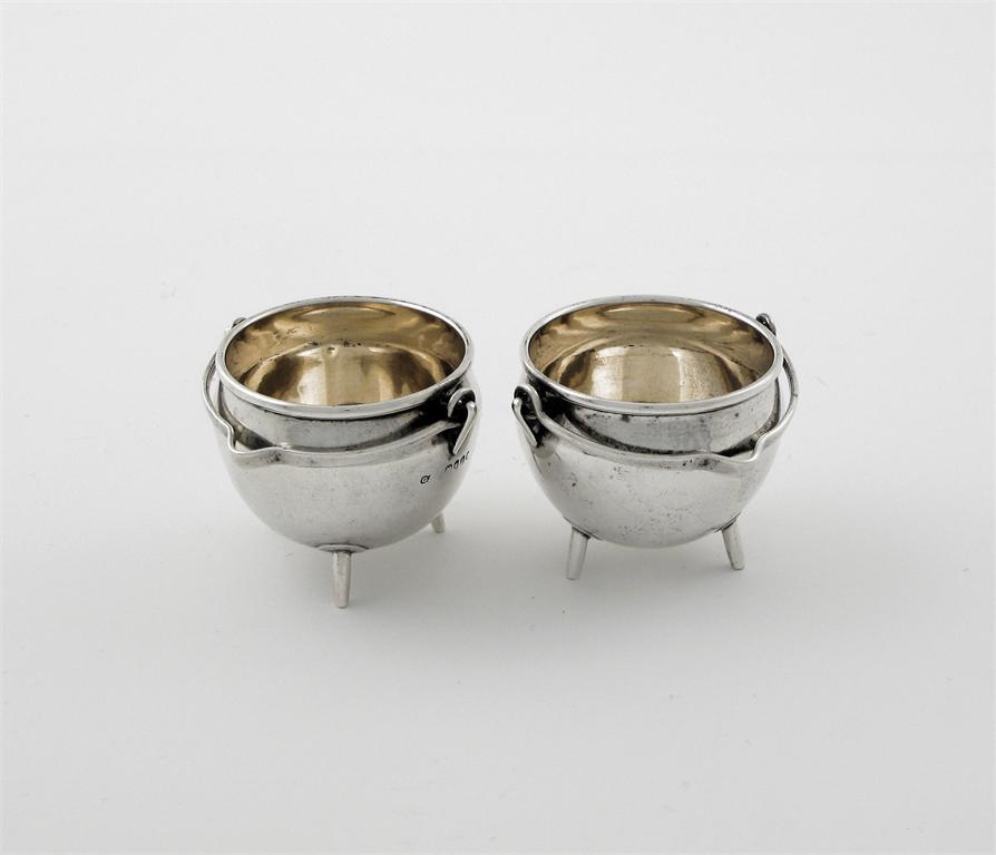 A pair of Victorian cauldron salts, on three legs with swing handles and gilt interiors, by George Adams, London 1863, 1.75in (4.5cm) diameter, 2.25oz. (2)