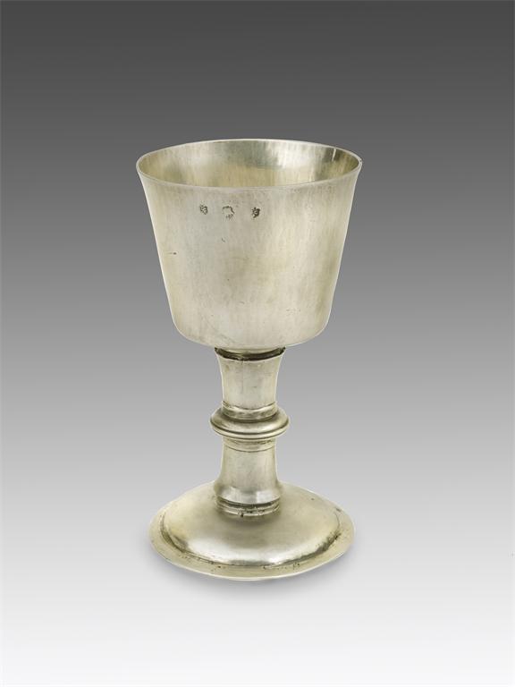 An early 17th century wine goblet, on a low-domed, circular foot with a knopped, waisted cylindrical and a plain, flared bowl, maker's mark only "IC" in a shaped shield, with a mullet [stuck twice on the bowl and twice on the foot] and once on the bowl, with a turret mark and the initials "LG", unascribed 1620-1640, 6.6in (16.8cm) high, 8.5oz.