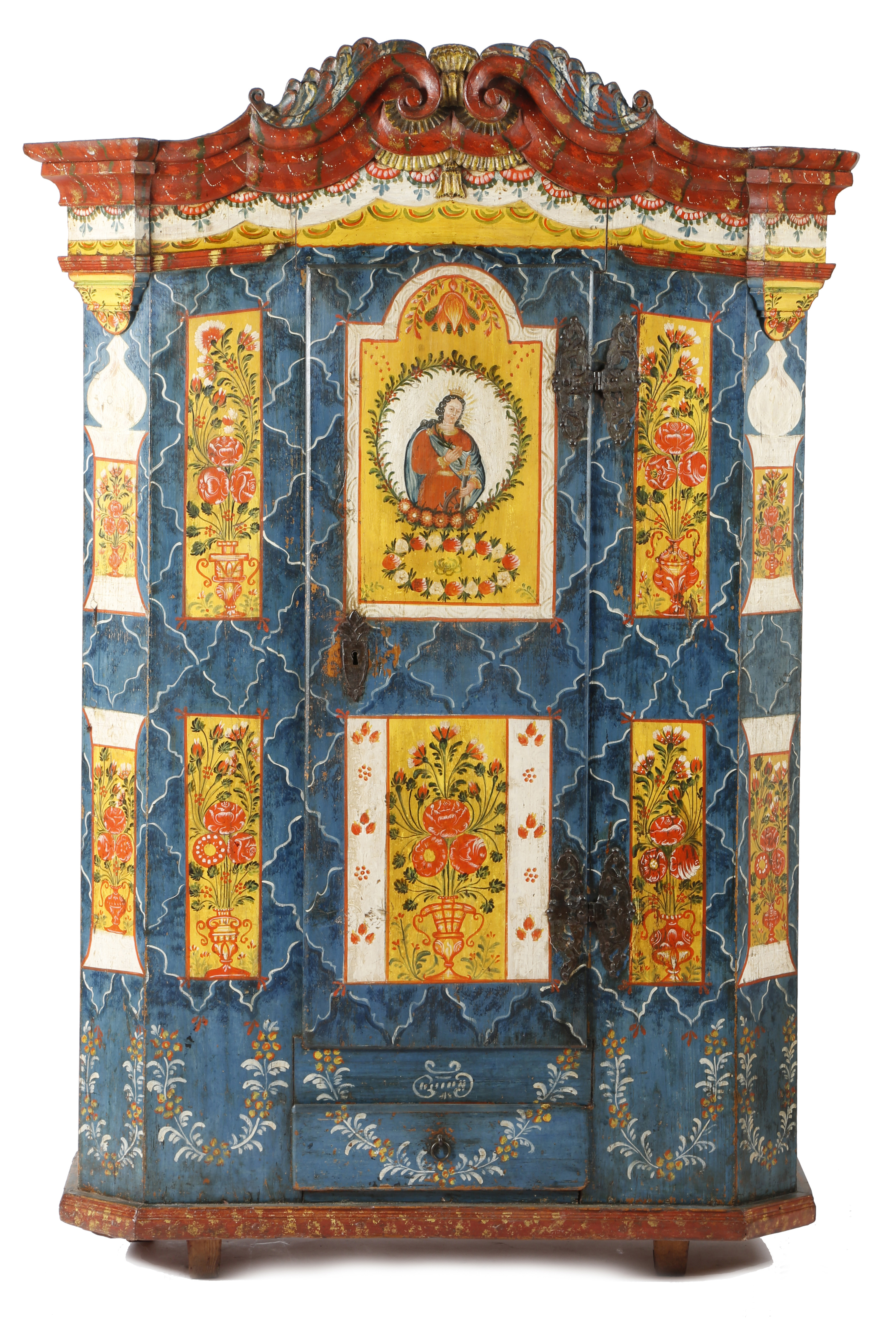 A Bohemian painted pine armoire, polychrome decorated with panels of urns of flowers and a central panel depicting a portrait of Saint Catherine, with a scroll cornice above a door revealing three shelves, the base with a drawer, late 18th / early 19th century, 183cm high, 123cm wide, 50.5cm deep.