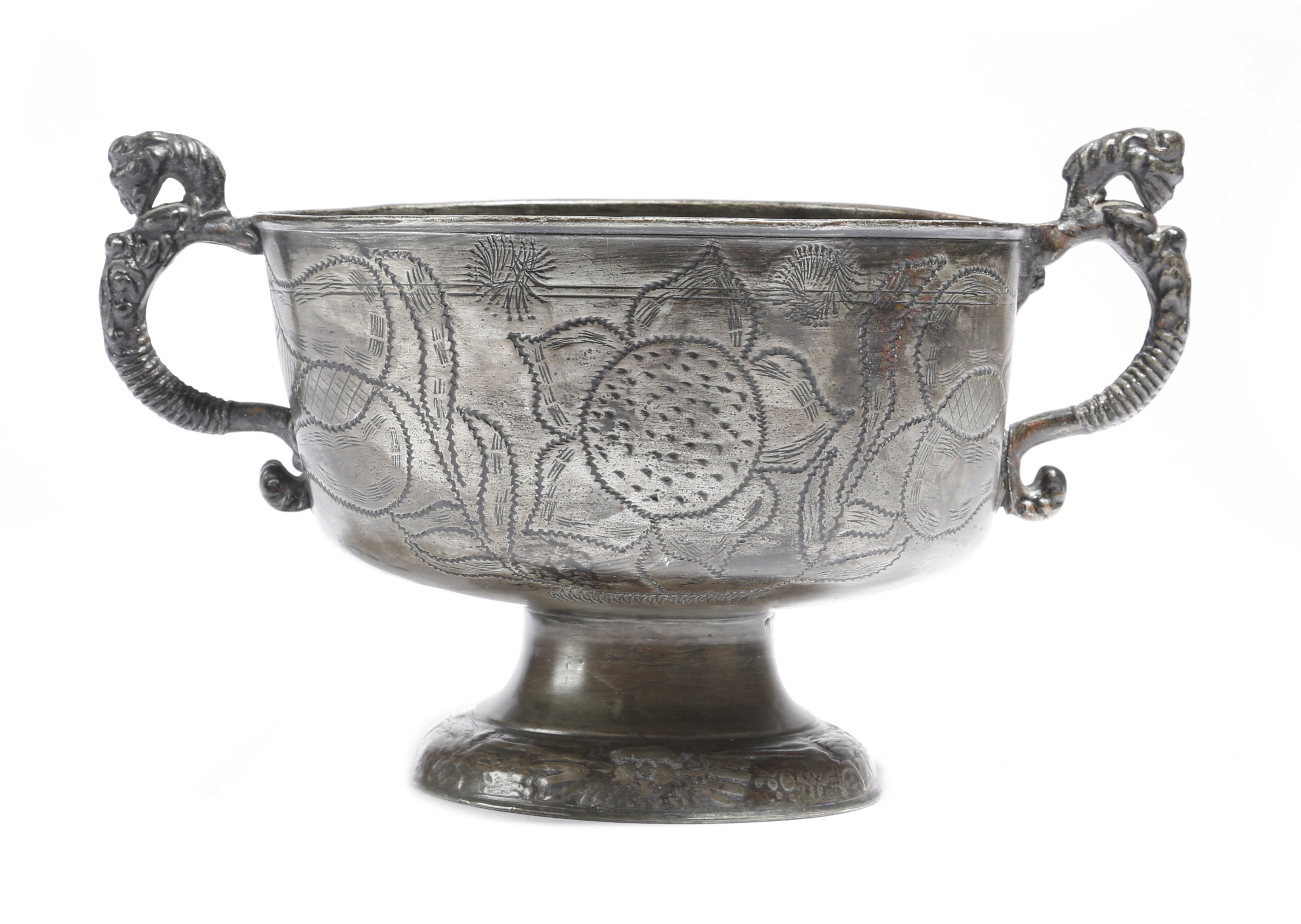 A pewter footed bowl, the body wriggle work decorated with tulips, leaves and flowers, with a pair of mythical beast scroll handles, probably later, the interior with owners triad initials 'AMC' and a faint touch mark, on an angel's head mask decorated foot, possibly Dutch, late 17th century and later, 12cm high, 20cm wide.