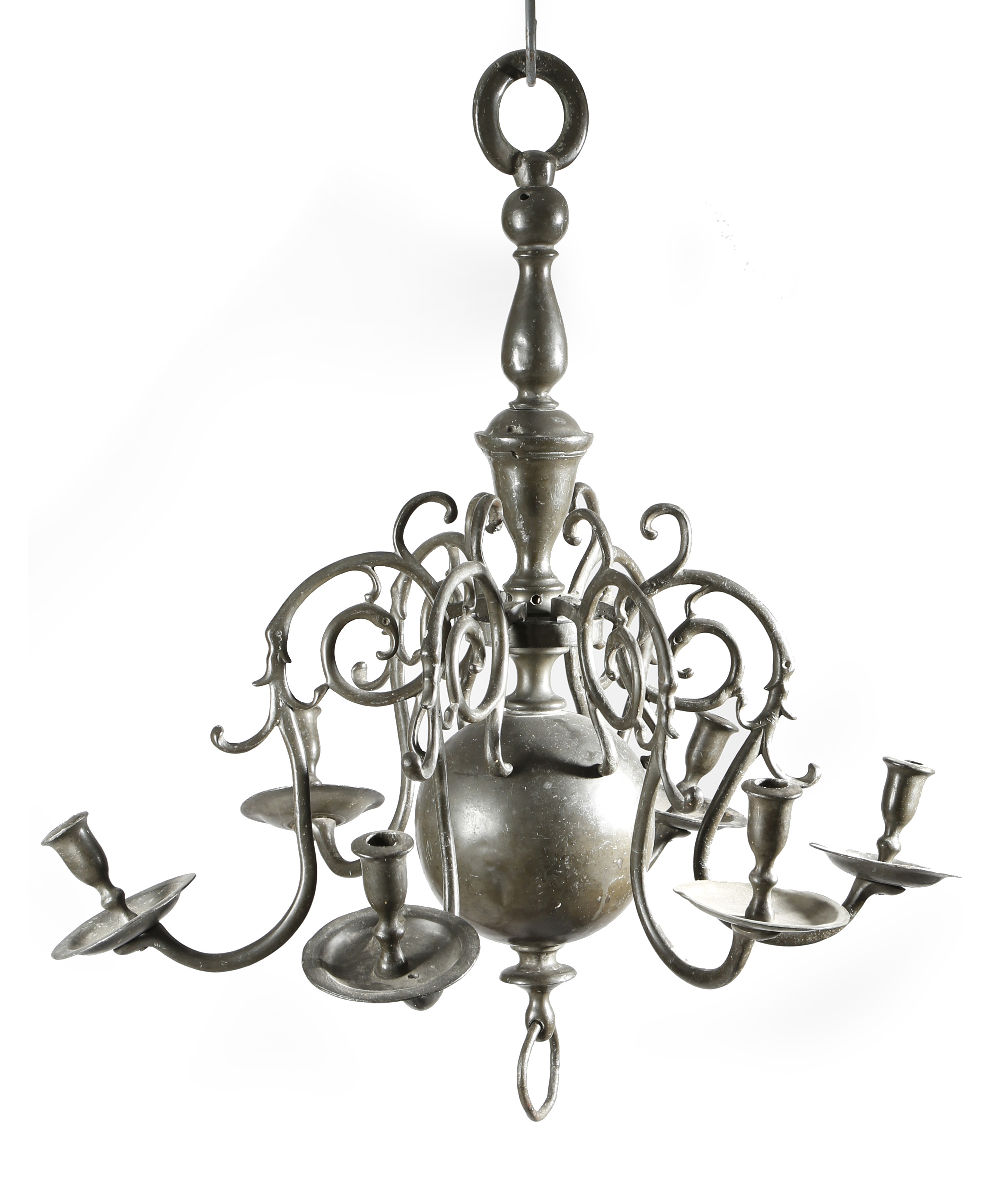 A pewter six light chandelier in 17th century Dutch style, with a vase and ball turned stem issuing scroll branches, with dished drip-trays and urn nozzles, 64.5cm high, 56.5cm wide.