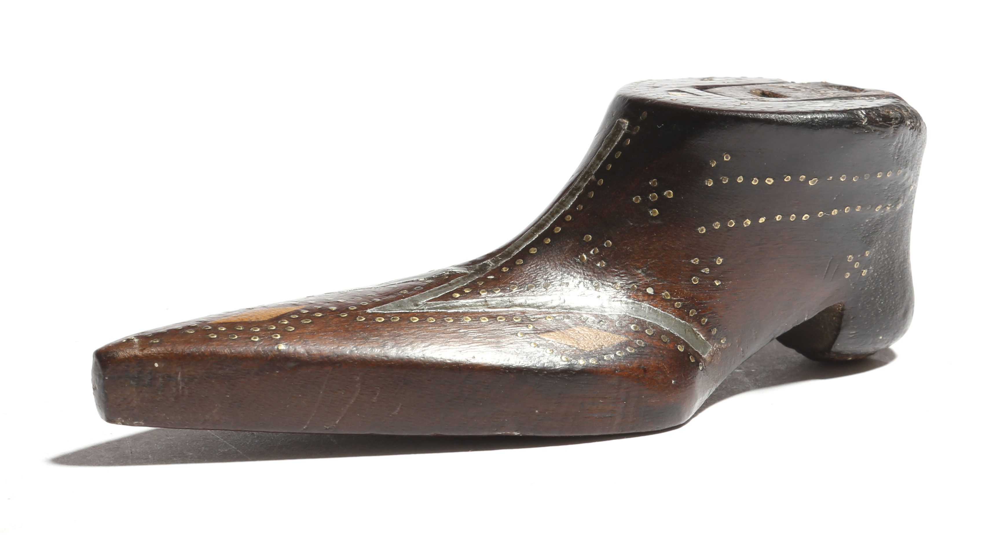 A 19th century treen snuff shoe, inlaid with mother of pearl and fruitwood, with pewter stringing and tack decoration, with a sliding cover, 11.8cm long.