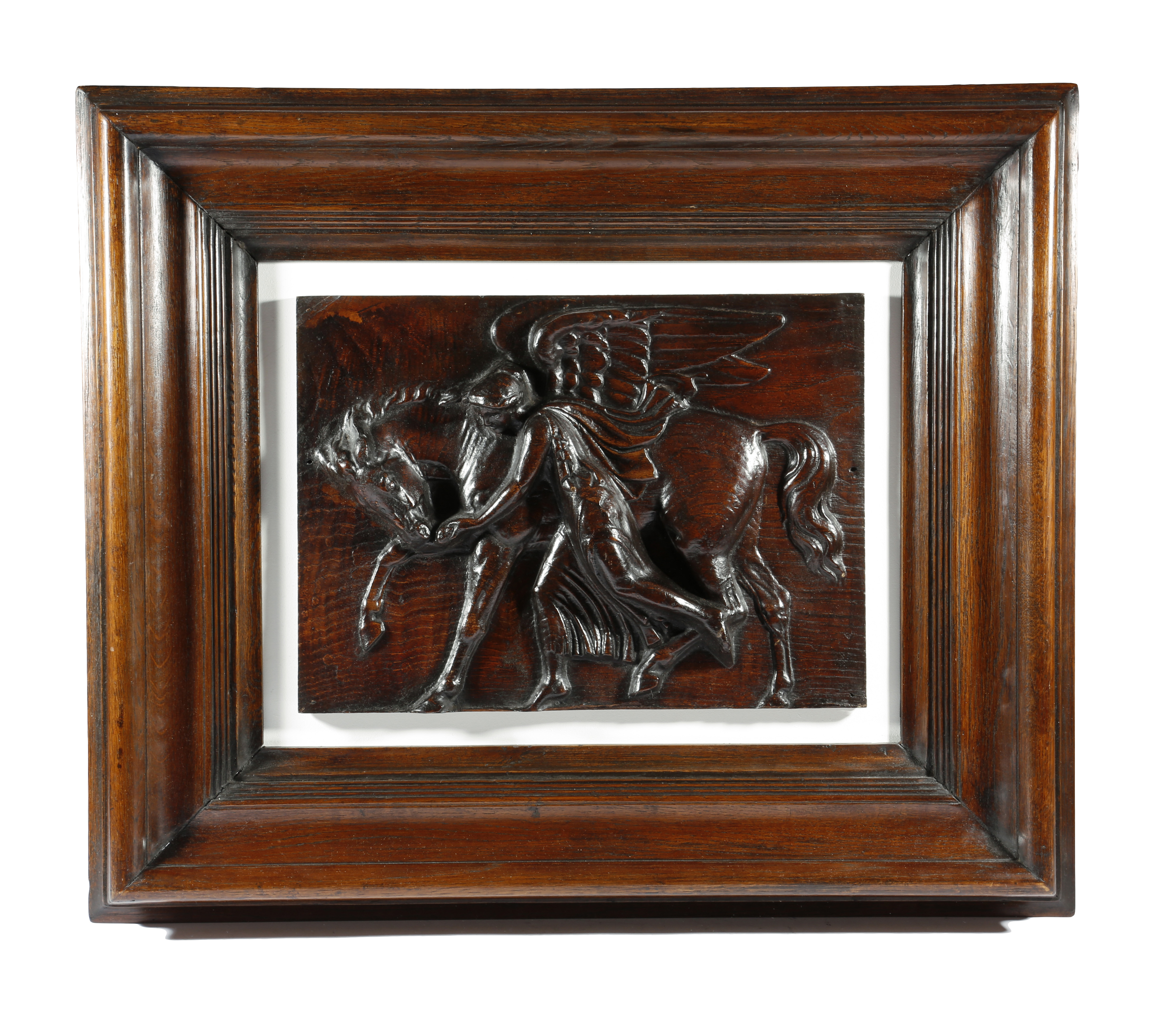 An elm relief panel, carved with pegasus and a female attendant, late 18th / early 19th century, 30.3 x 41.3cm, later mounted in a moulded oak frame.