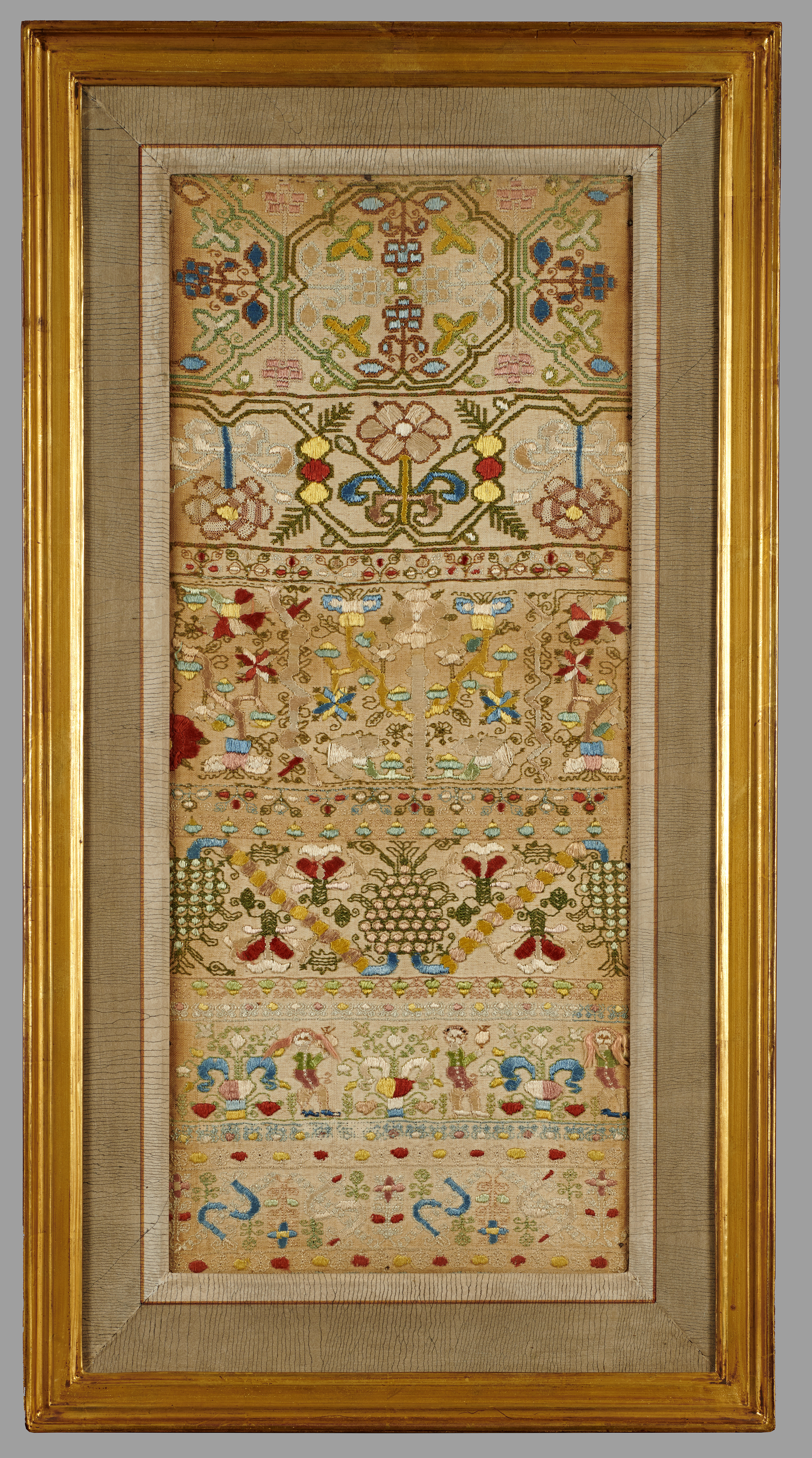 A rare Charles II band sampler, worked with coloured silk on a linen ground with long-armed cross, double-running, satin and detached buttonhole stitches with bands of flowers, pineapples and with 'boxer figures' with raised trailing strands of silk hanging from their heads, possibly representing periwigs, interspersed with urns of flowers, undated but mid- to late 17th century, 51 x 21.5cm in a later glazed gilt frame.