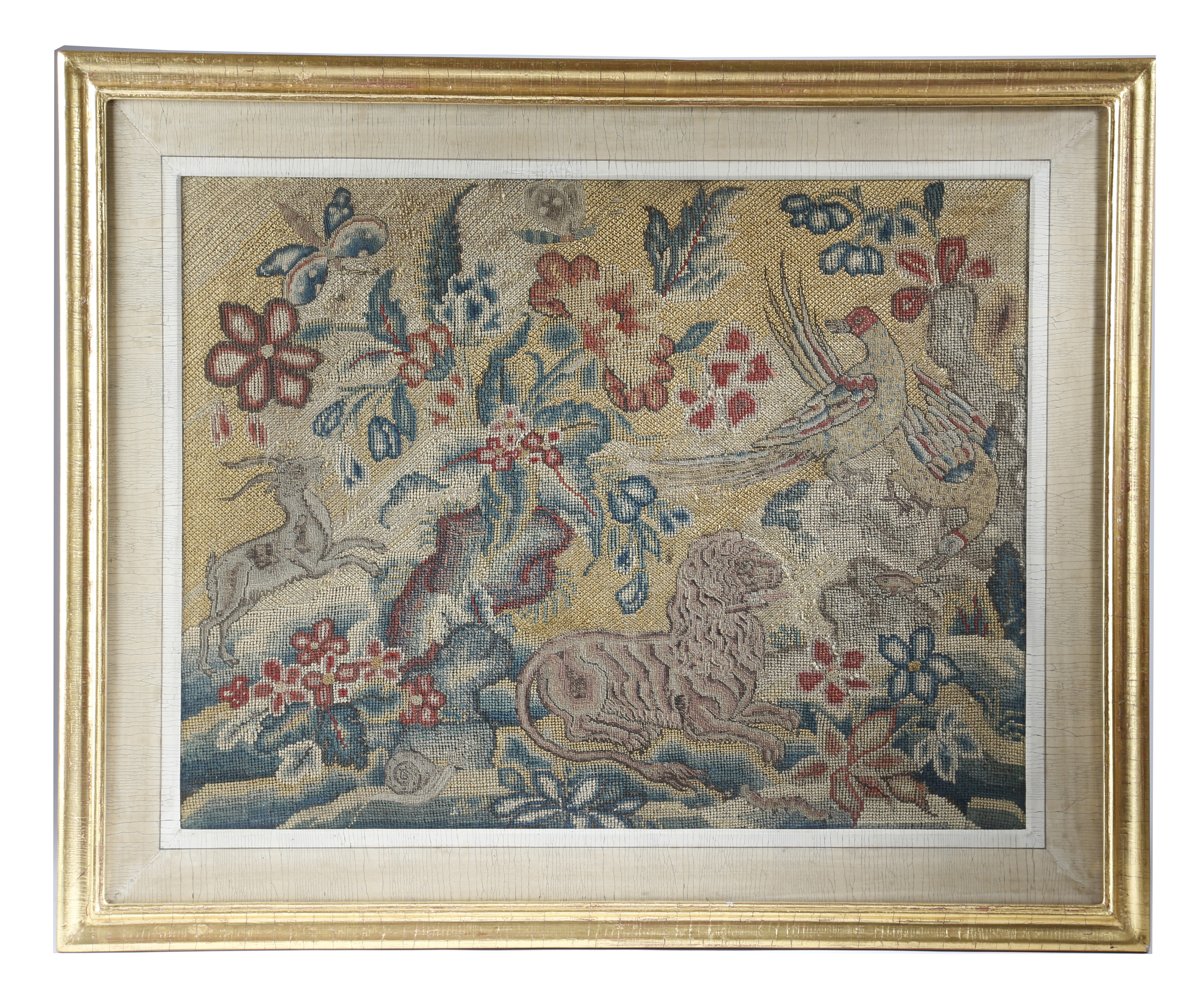 An early 18th century needlework picture, worked in gros and petit point with a goat, a lion, exotic birds, butterflies, a snail, a caterpillar and flowers, 44.5 x 58cm, in a later glazed gilt frame.