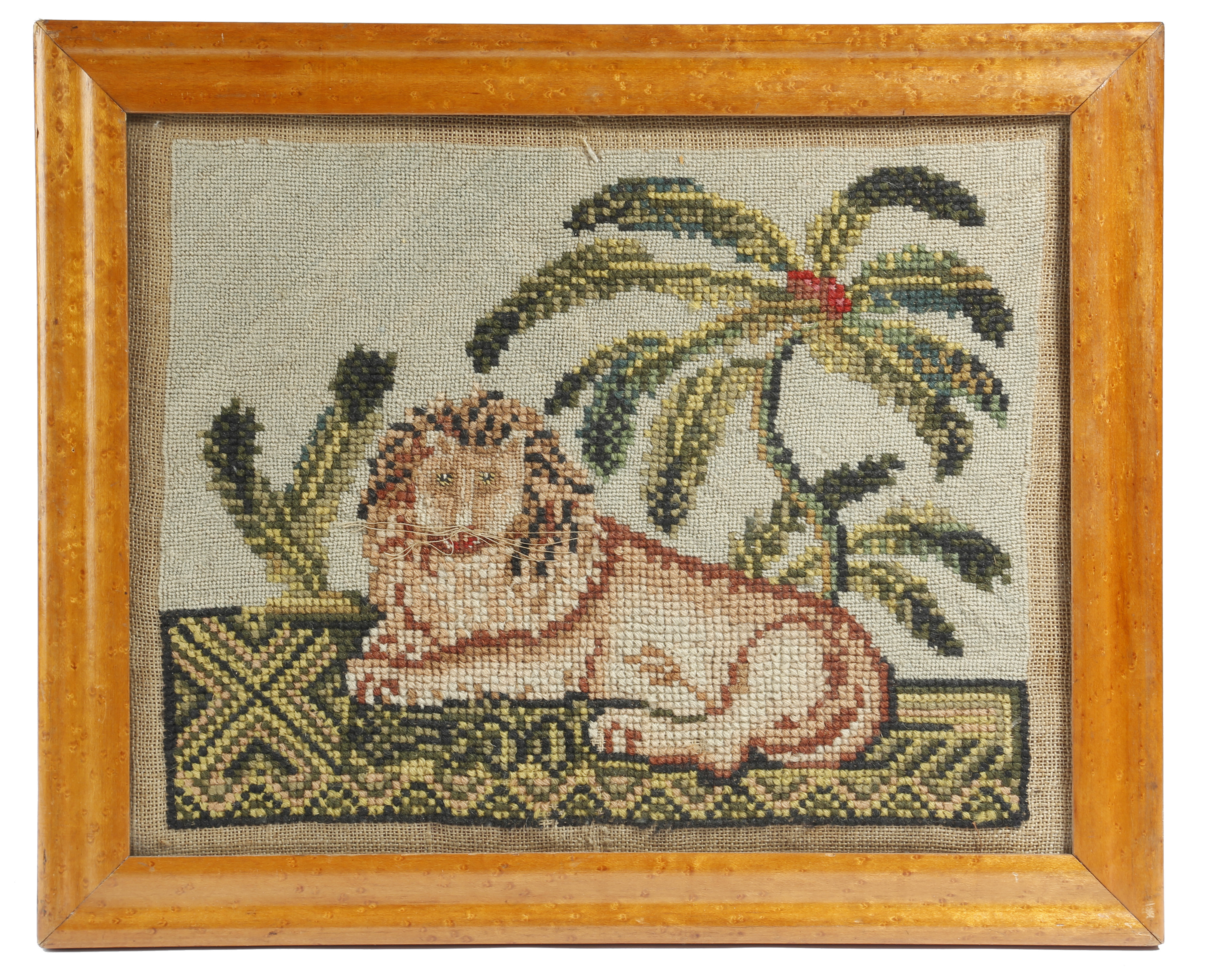 Two Victorian Berlin woolwork pictures, one of a tiger, signed with initials lower right, the other of a recumbent lion, both framed and glazed, 44.3 x 53.2cm (max). (2)