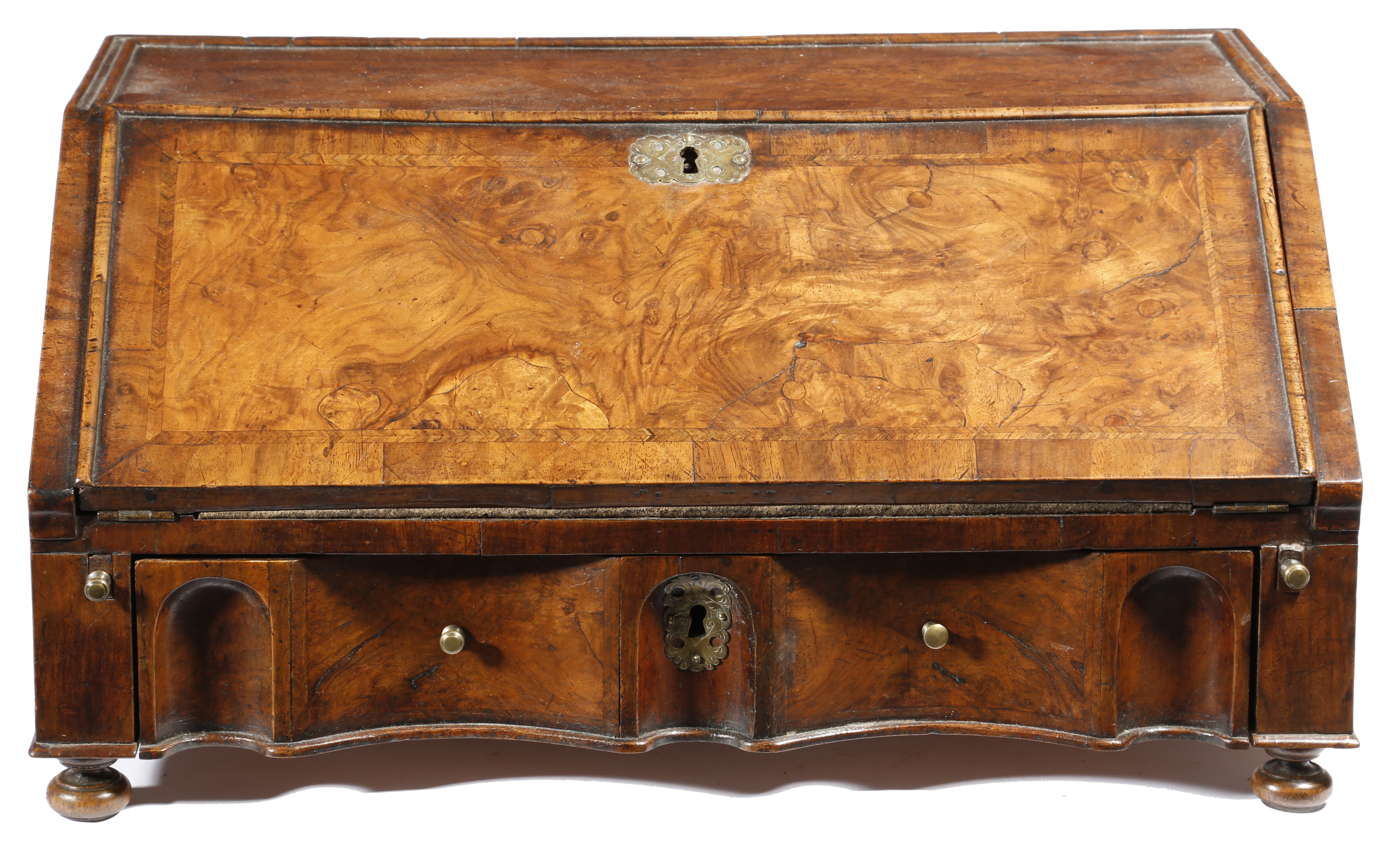 An early 18th century walnut table top bureau, with cross and feather banding, the hinged fall revealing a stepped interior with pigeonholes and drawers, one fitted for pens and ink, another with a hinged mirror, above a shaped divided frieze drawer, fitted with six boxes, three brushes and a pin cushion, on flattened bun feet, 23.7cm high, 49.2cm wide, 31cm deep.