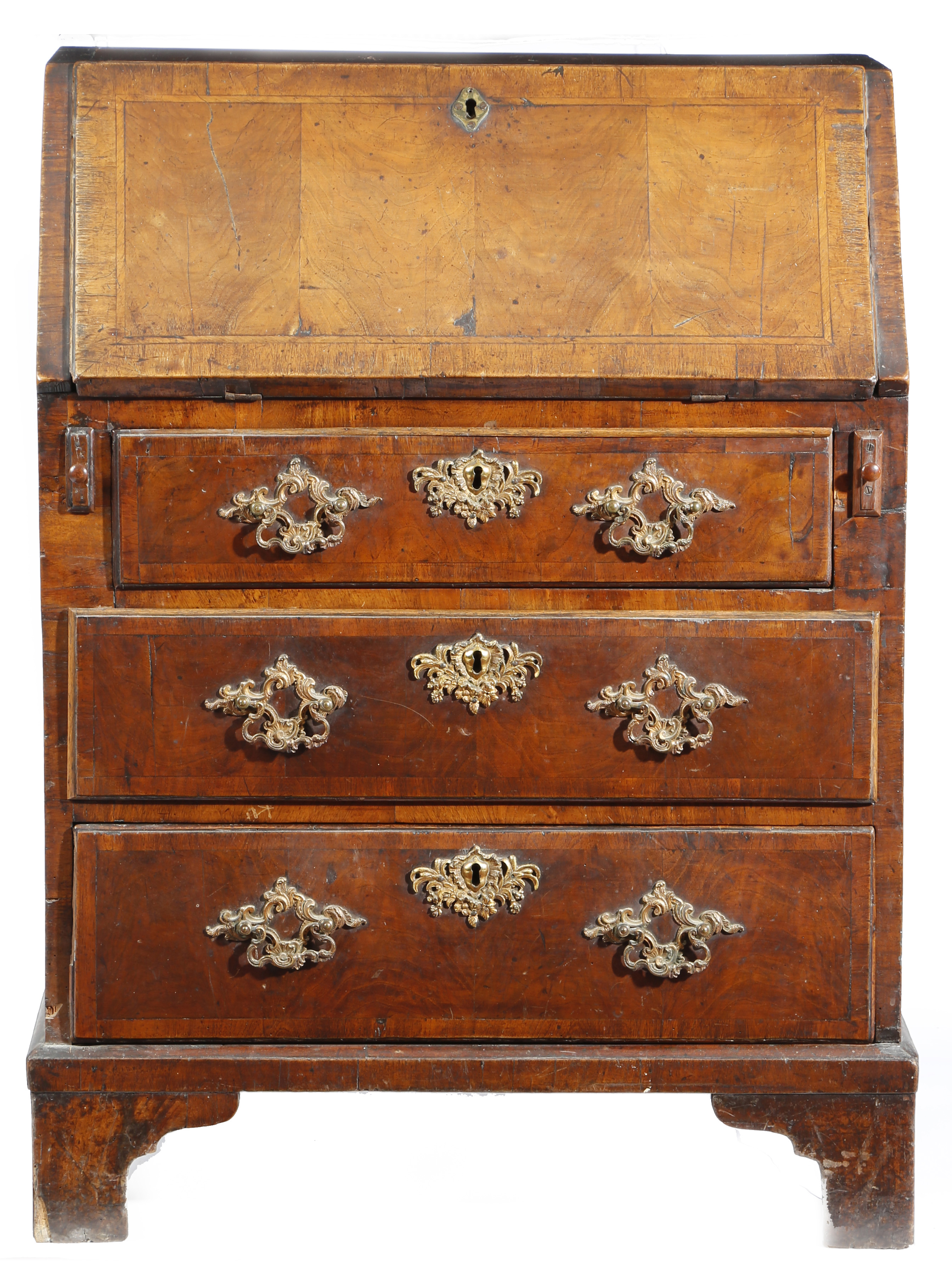 A George II walnut bureau, with cross and feather banding, the hinged fall revealing a fitted interior with holes and pigeonholes, above three long graduated drawers and bracket feet, 93.1cm high, 70.9cm wide, 44.3cm deep.