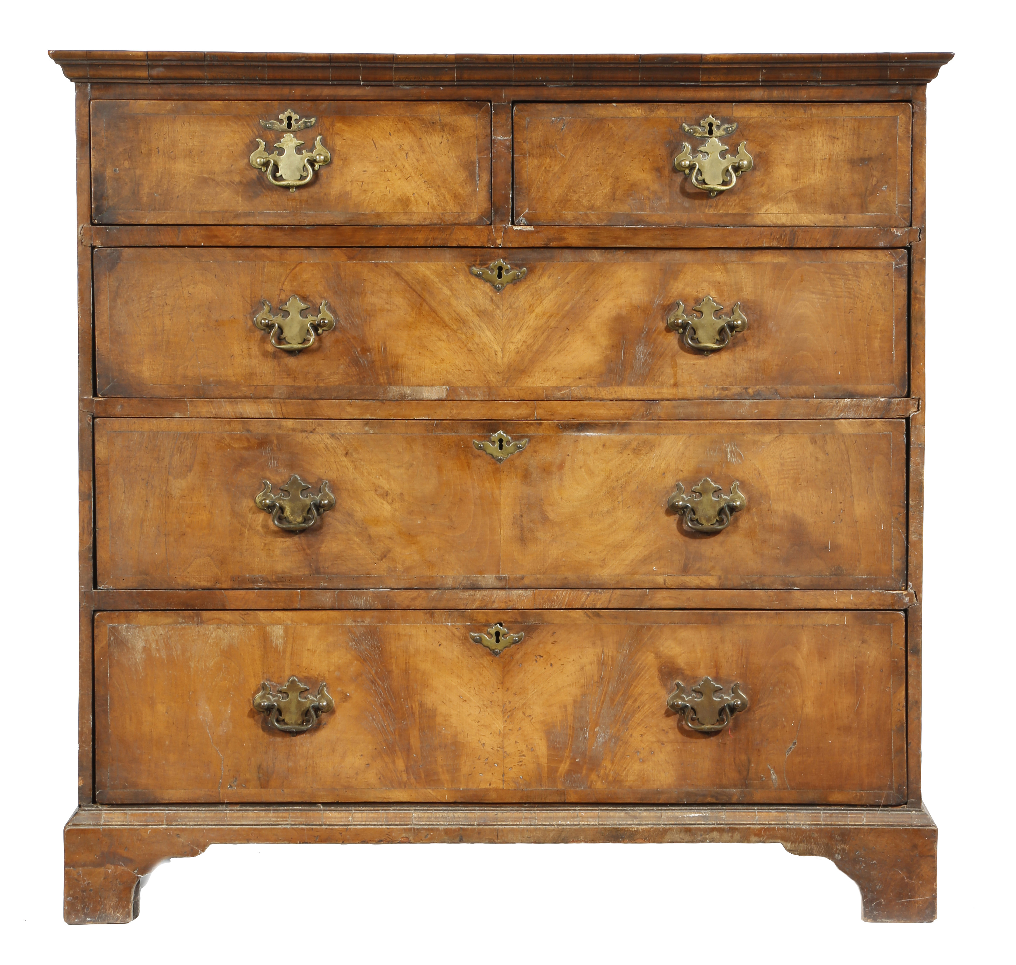 A walnut chest, the crossbanded top above two short and four long conforming drawers, on bracket feet, 95.2cm high, 97.7cm wide, 46.2cm deep.