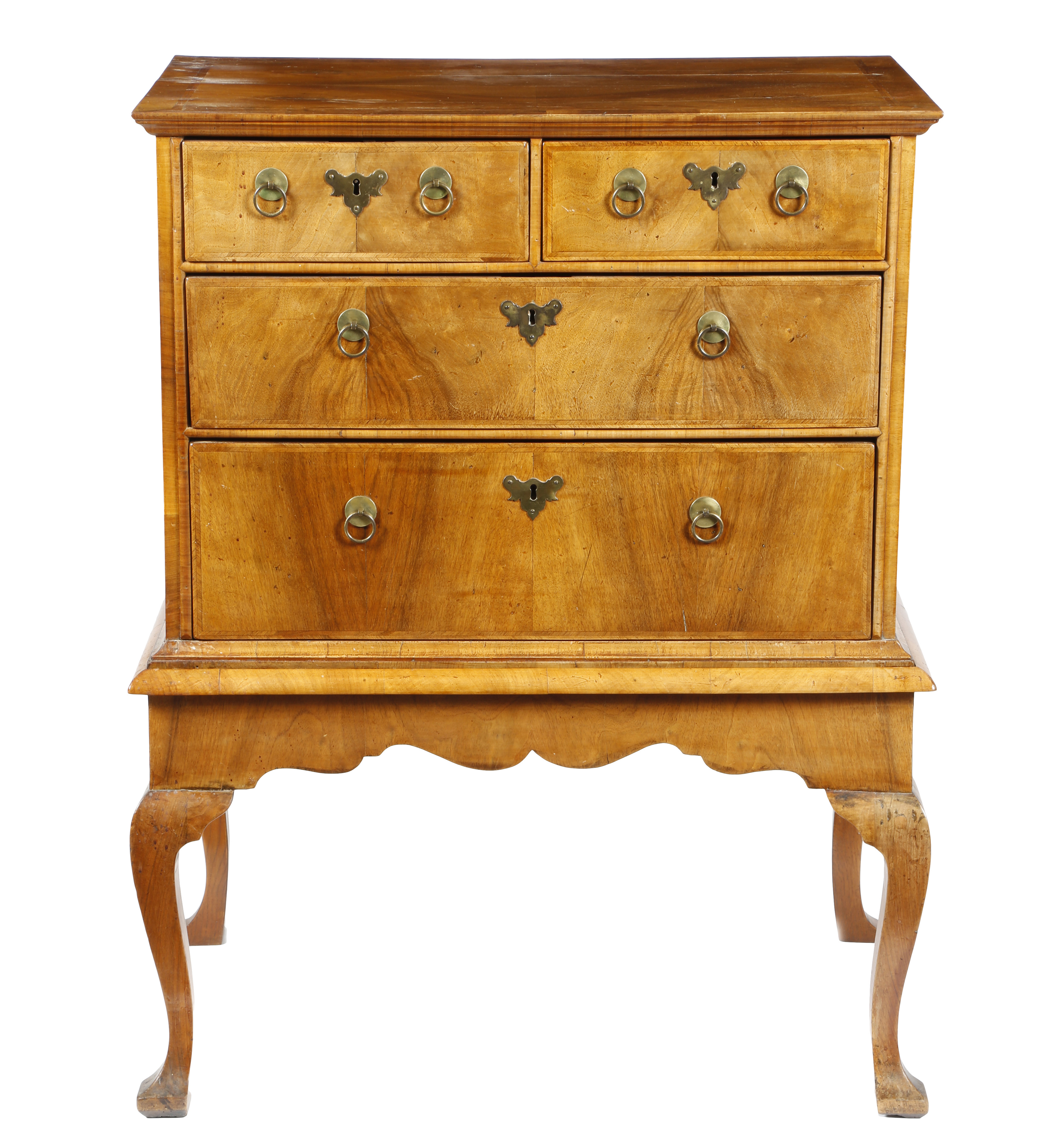 A walnut chest on stand, the quarter veneered top with cross and feather banding, above two short and two long drawers, on square section cabriole legs, early 18th century elements, 105.7cm high, 83.5cm wide, 56.5cm deep.