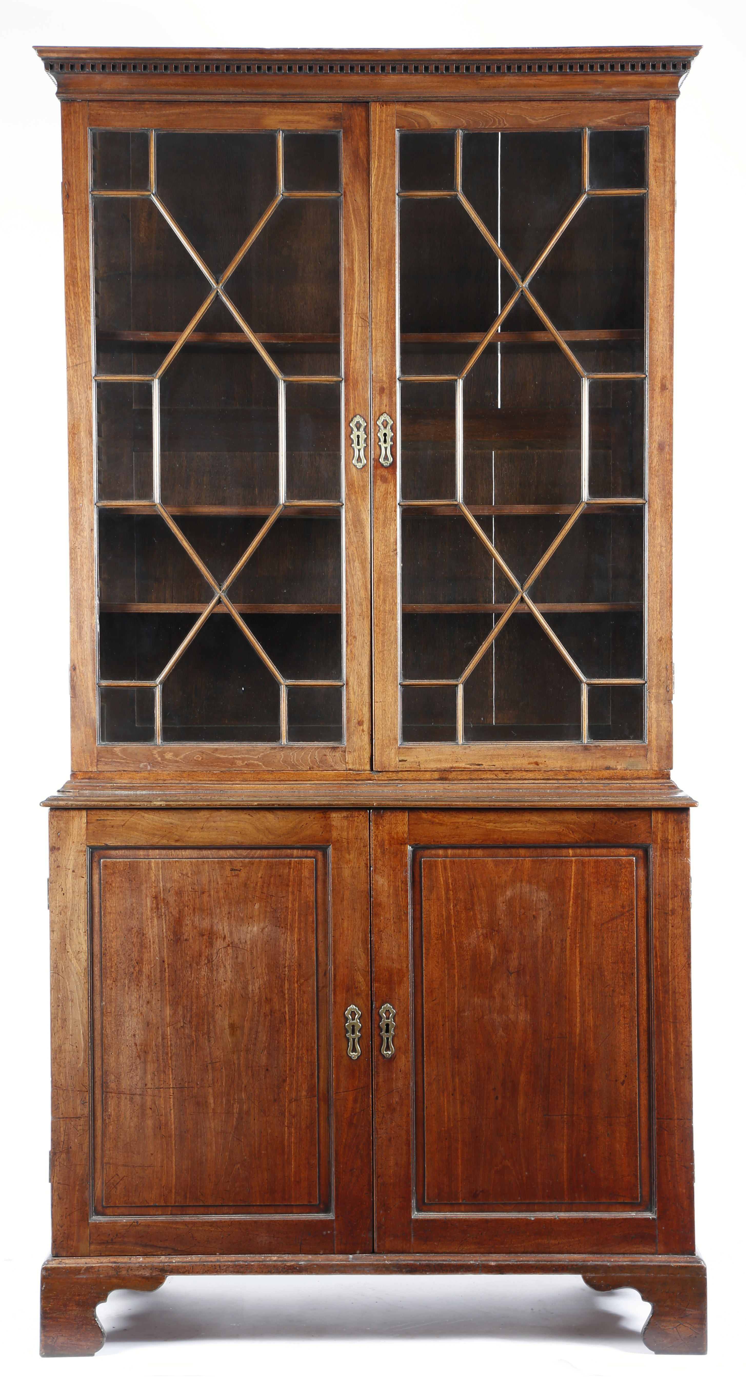 A George II mahogany bookcase cabinet, the dentil cornice above a pair of geometric astragal glazed doors enclosing three adjustable shelves, above a pair of fielded panel cupboard doors, enclosing two shelves, on bracket feet, with brass side carrying handles, 214cm high, 110cm wide, 50cm deep.