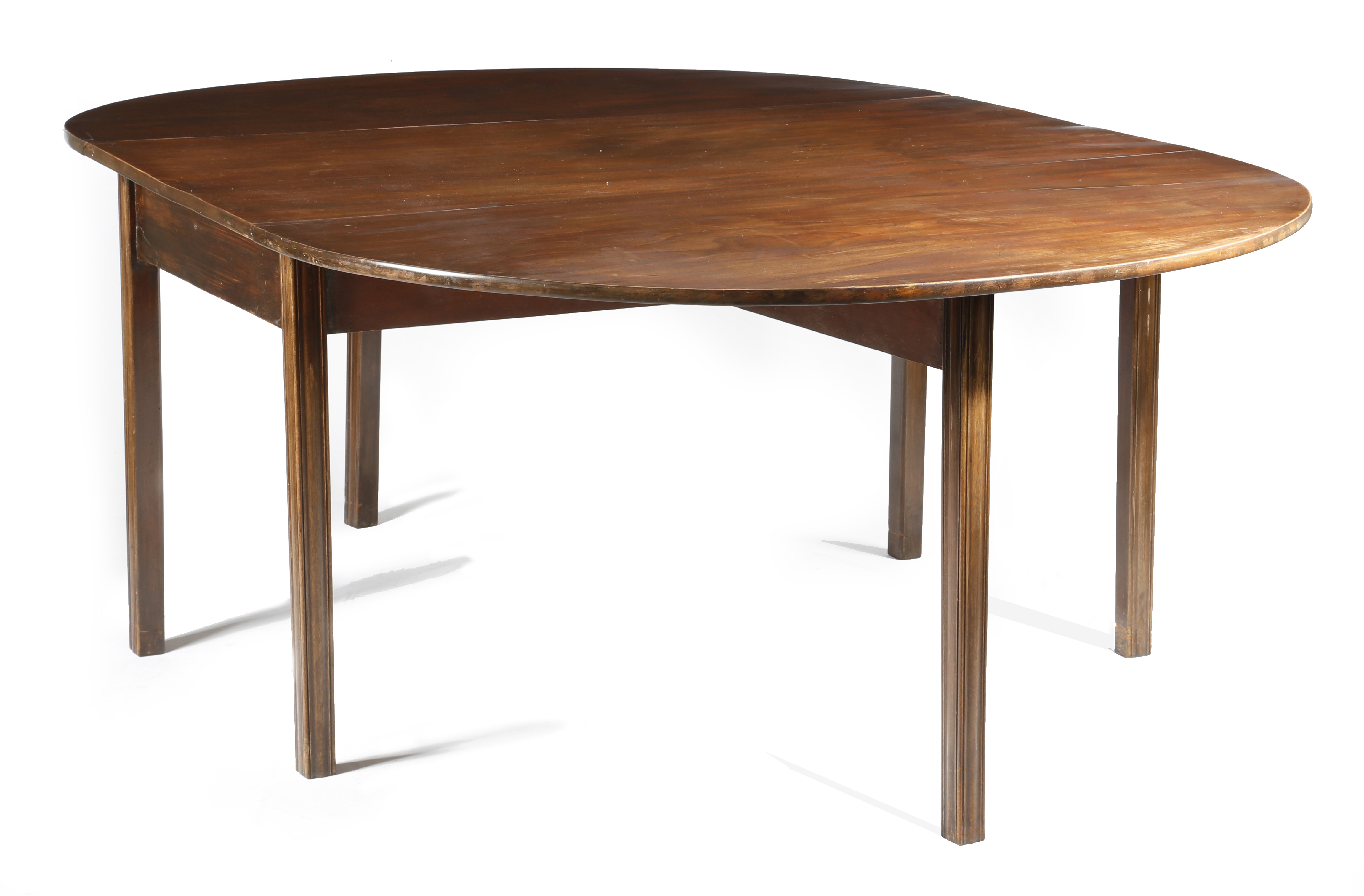 A George III mahogany gateleg dining table, the oval drop-leaf top on moulded legs, 71cm high, 137.2cm wide, 195.4cm deep (open).