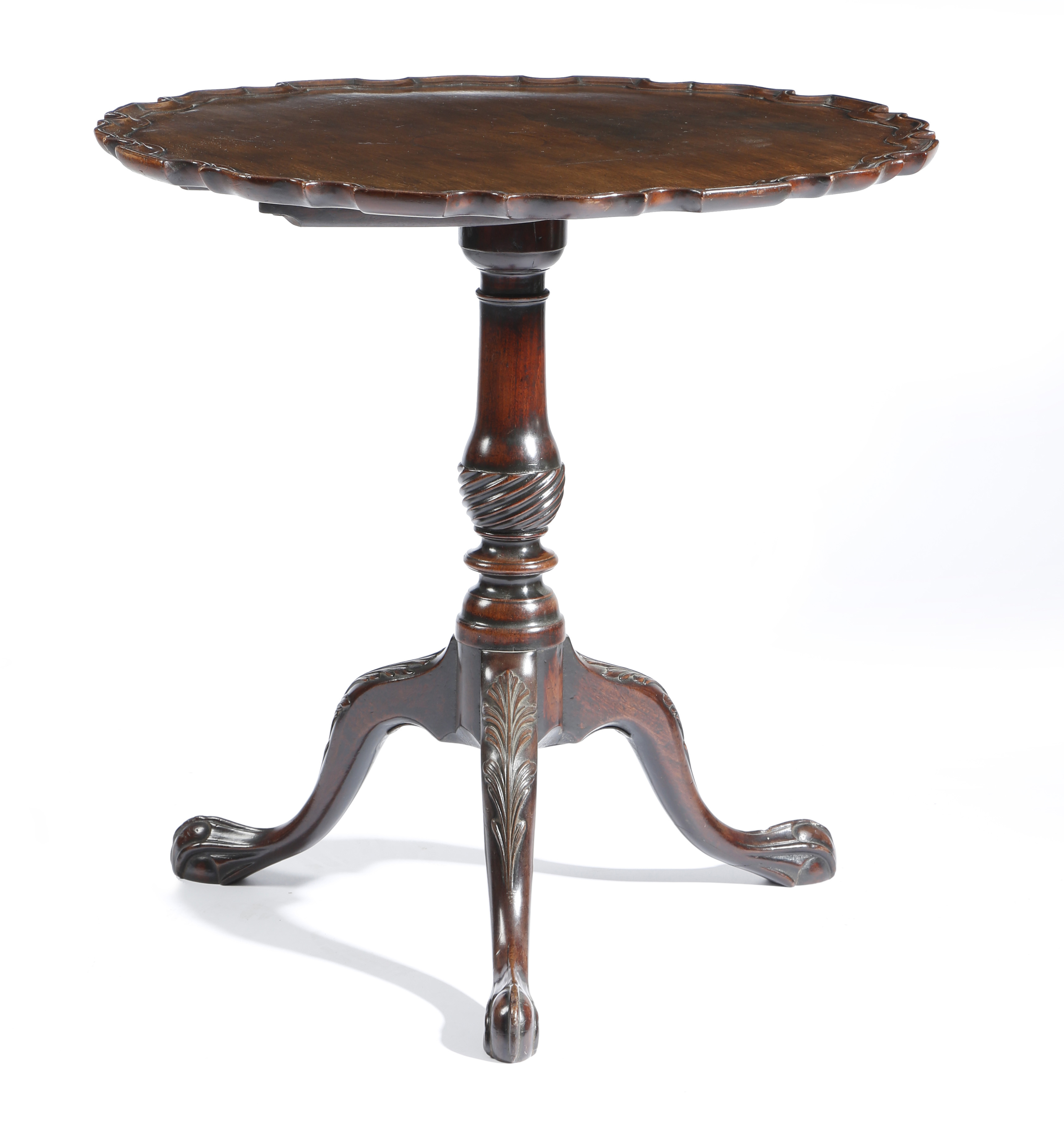 A mahogany pie-crust table, the circular tilt-top with a pie-crust moulded edge, on a turned stem with a fluted bowl, on leaf capped cabriole legs and claw and ball feet, George II and later, 72.3cm high, 72.5cm diameter.