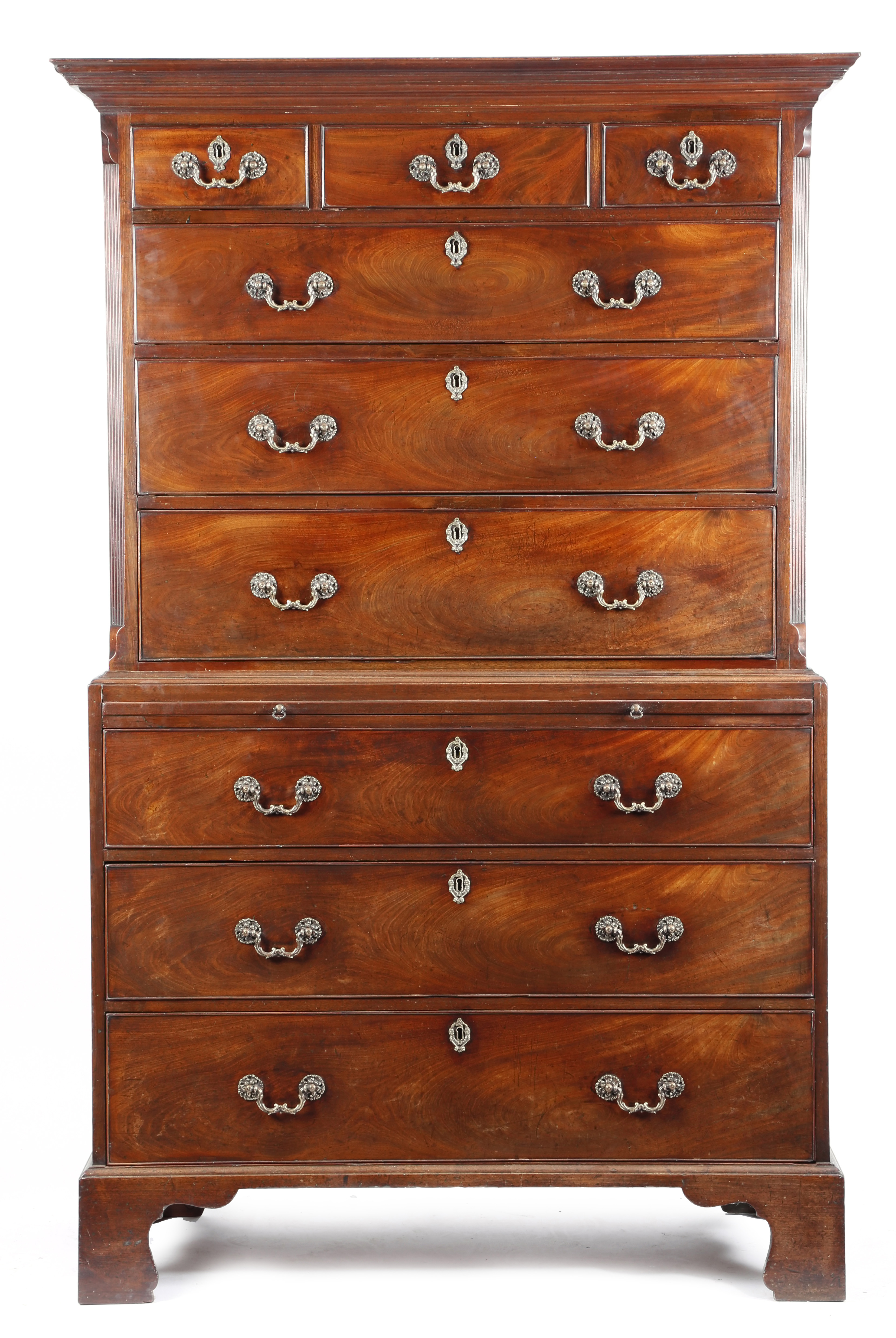 An early George III mahogany chest on chest, the moulded cornice above three short and three long drawers, flanked by fluted angles, the base with a brushing slide, above three long graduated drawers and bracket feet, 178cm high, 113.2cm wide, 53.8cm deep.