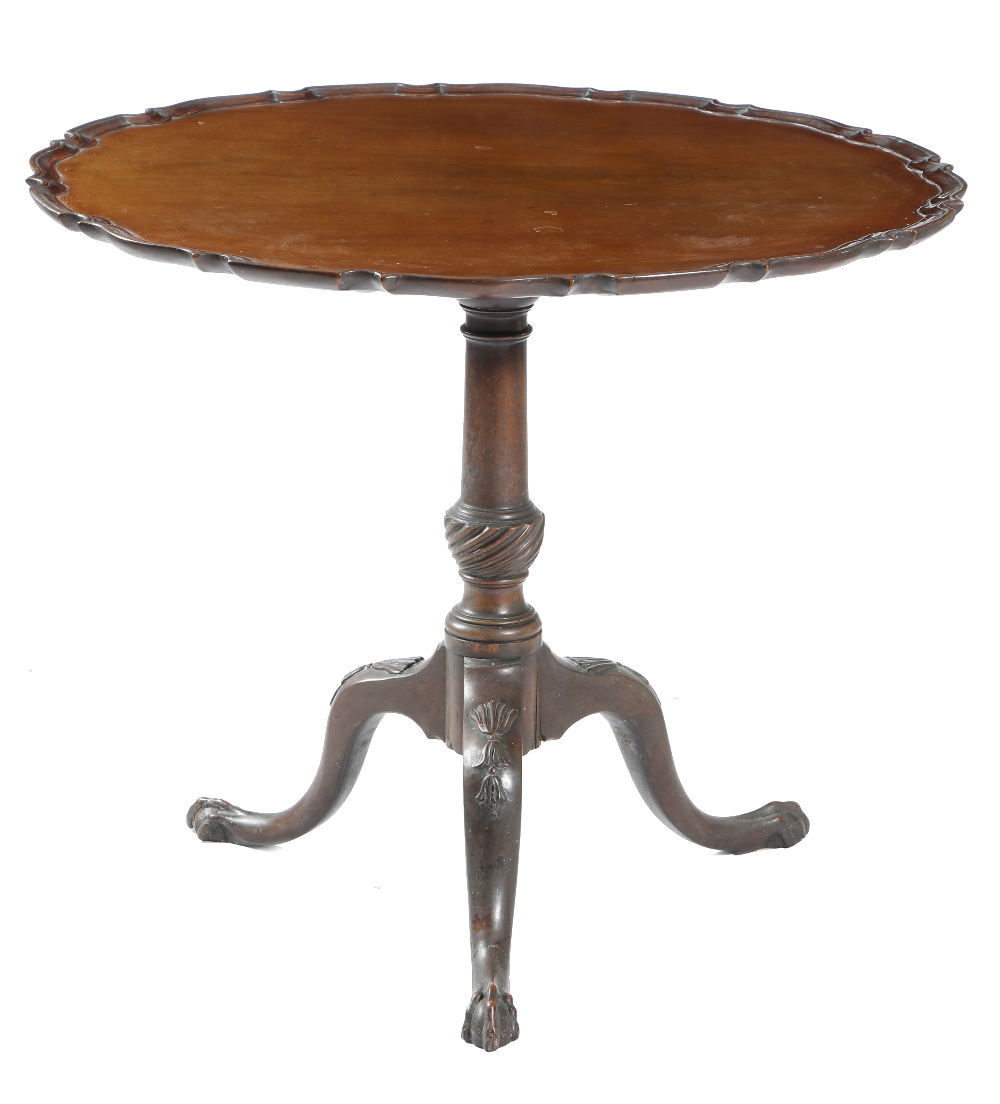 A George III mahogany tripod table, the circular tilt-top with a pie-crust moulded edge, on a turned stem with a fluted bowl, on shell and bell flower carved cabriole legs and claw and ball feet, 75cm high, 86.5cm diameter.