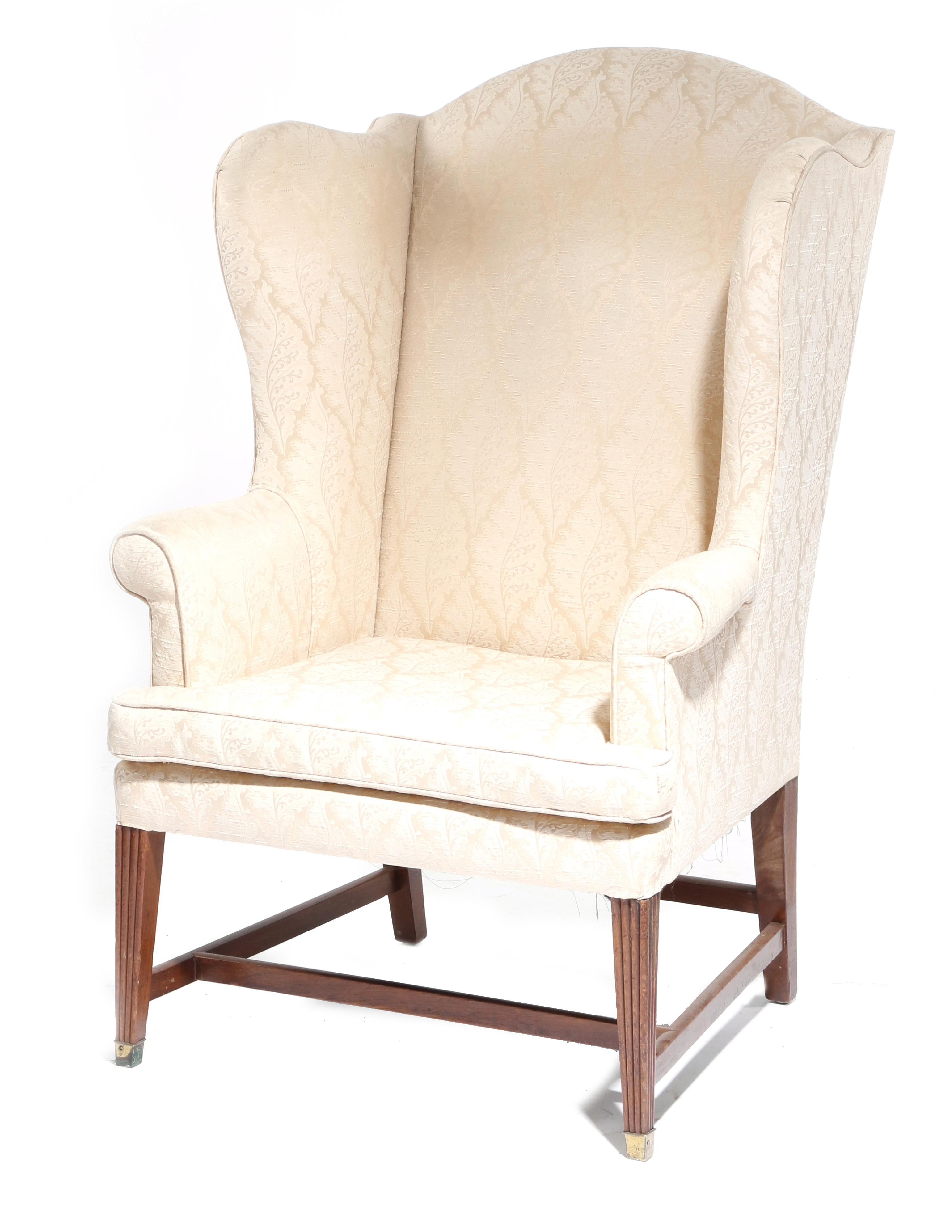 A George III wing armchair, later upholstered with a leaf design fabric, on reeded square tapering front legs with brass caps.