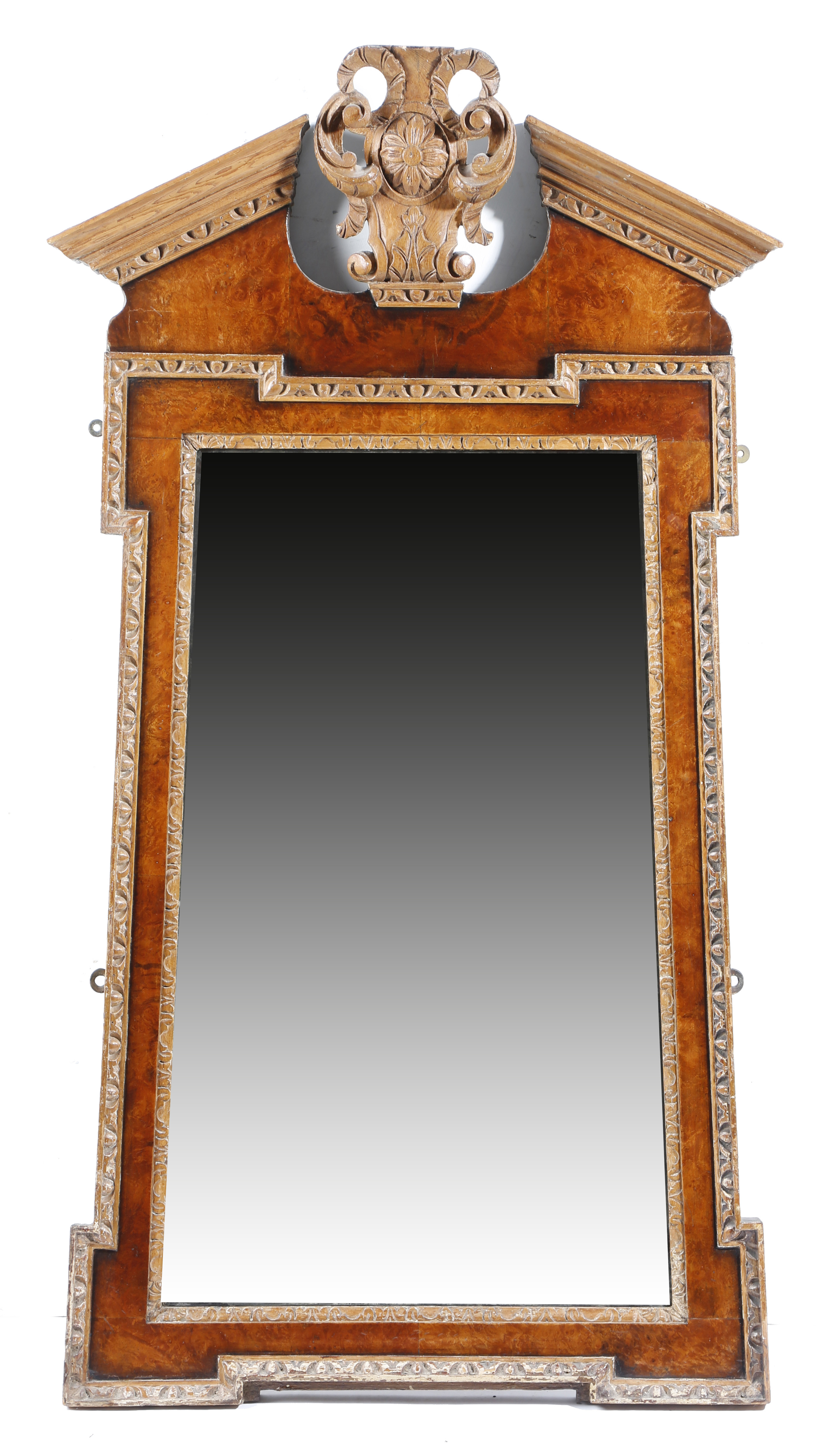 A George II walnut and carved pine wall mirror, of tapering shape, the bevelled plate within a carved slip and an egg and dart outer frame, with a broken arch pediment centred with a leaf and flower cartouche, 120 x 64.3cm.