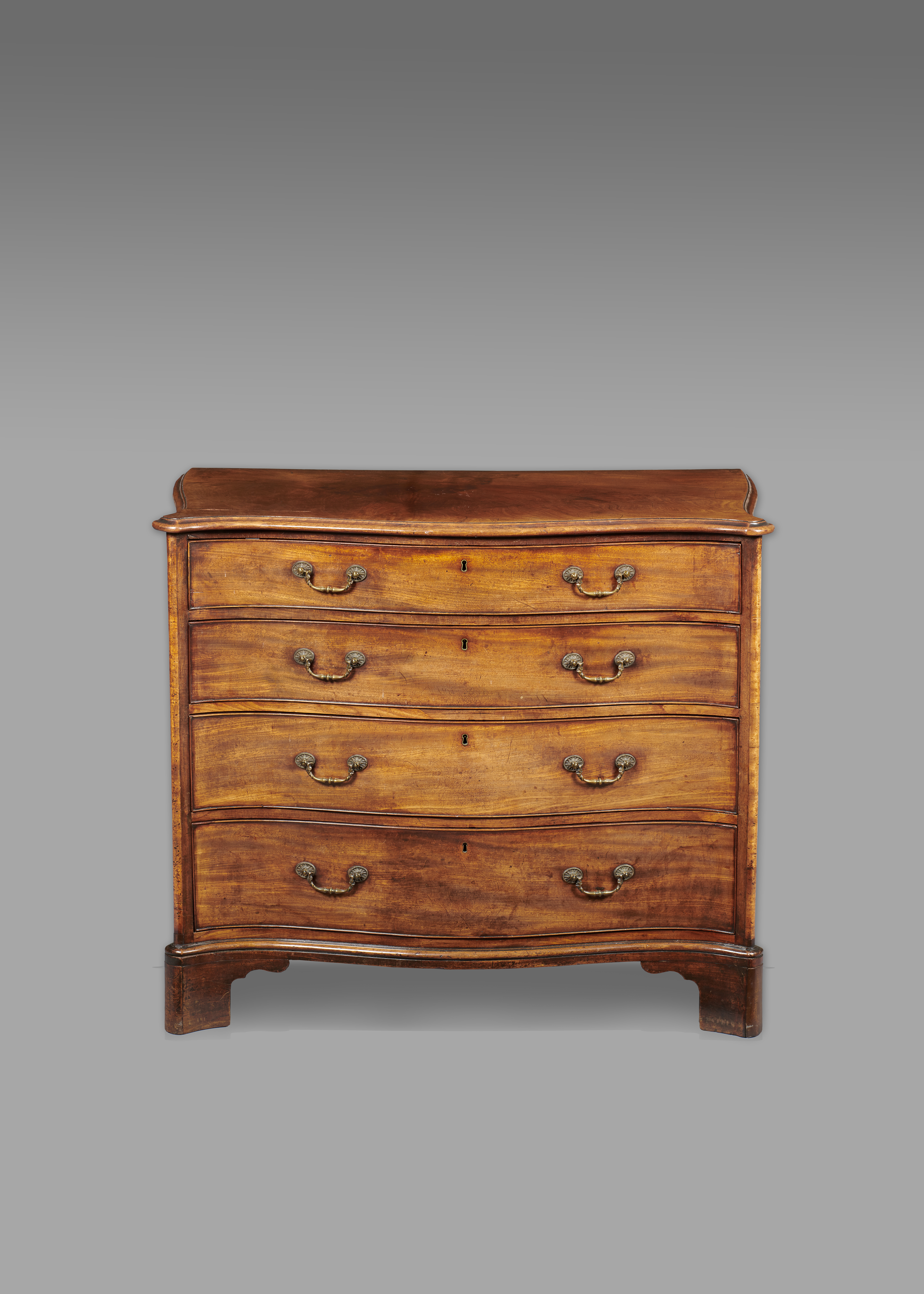 A George III mahogany serpentine dressing chest in the manner of Thomas Chippendale, the top with a moulded edge above four long graduated drawers, the top one with a baize lined slide revealing divisions, all fitted with original brass handles with flowerhead paterae plates, flanked by curved angles, on bracket feet, 88cm high, 107.1cm wide, 58.5cm deep.