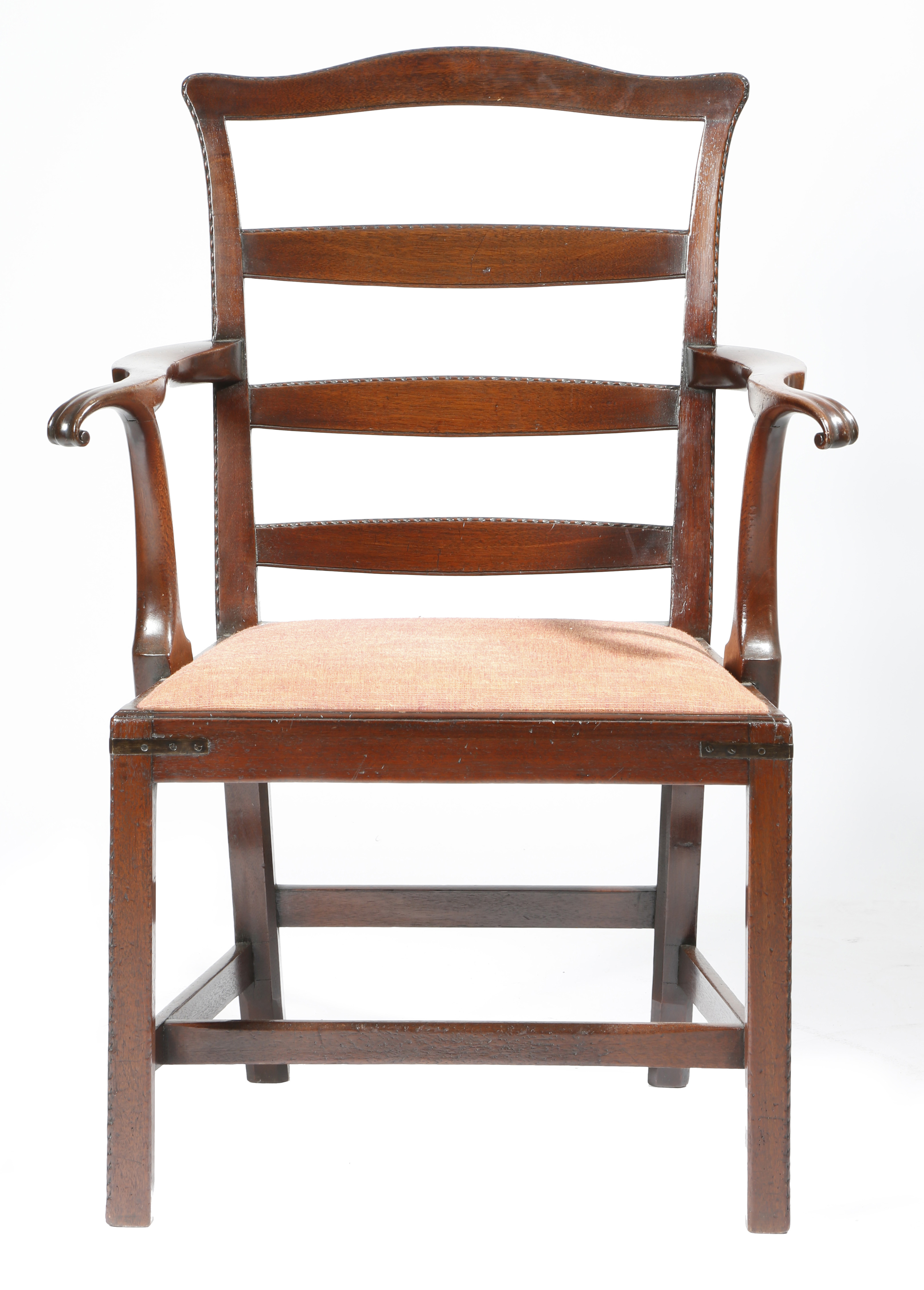 A George III mahogany open armchair, with carved cable decoration, the ladder back above a drop-in seat, on chamfered legs united by stretchers.