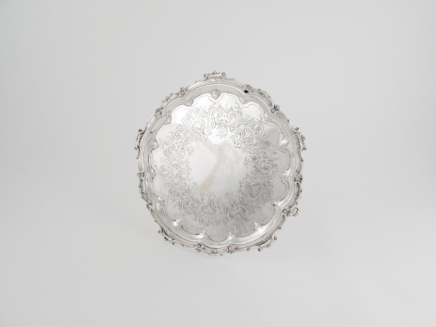 A Victorian engraved salver, with a shaped and moulded scroll border and moulded bracket feet, by H. Wilkinson & Co, Sheffield 1849, 12.25in (31cm) diameter, 23.5oz.