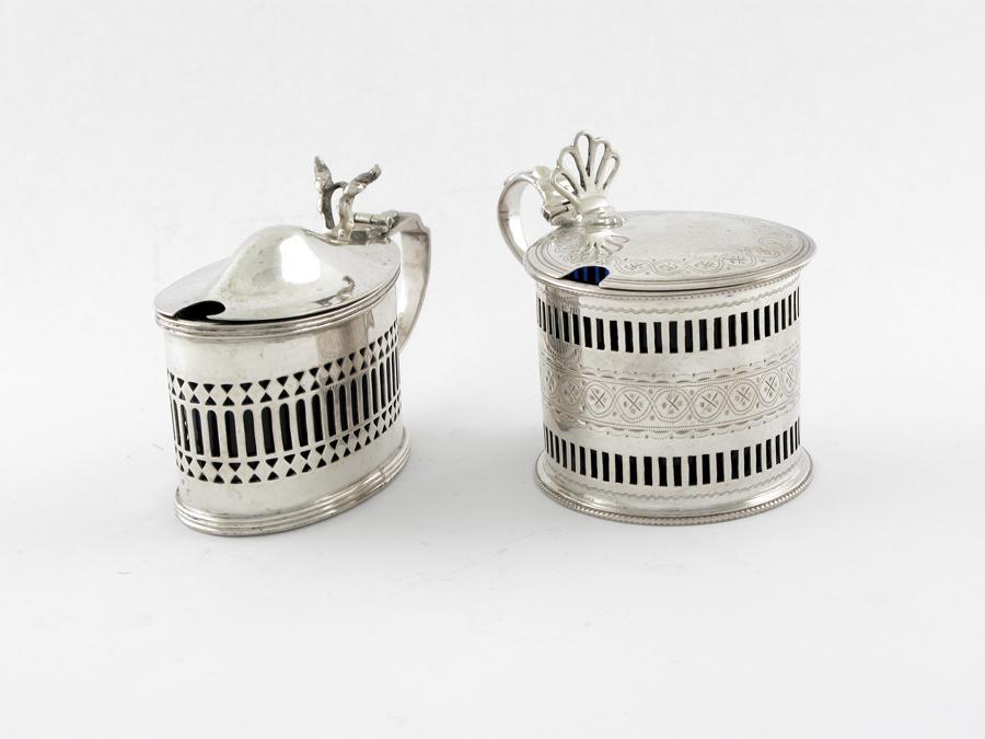 A modern pierced drum mustard, with engraving and a blue glass liner, London 1917 and a pierced oval mustard blue glass liner, Chester 1920, 5.5oz weighable silver. (2)